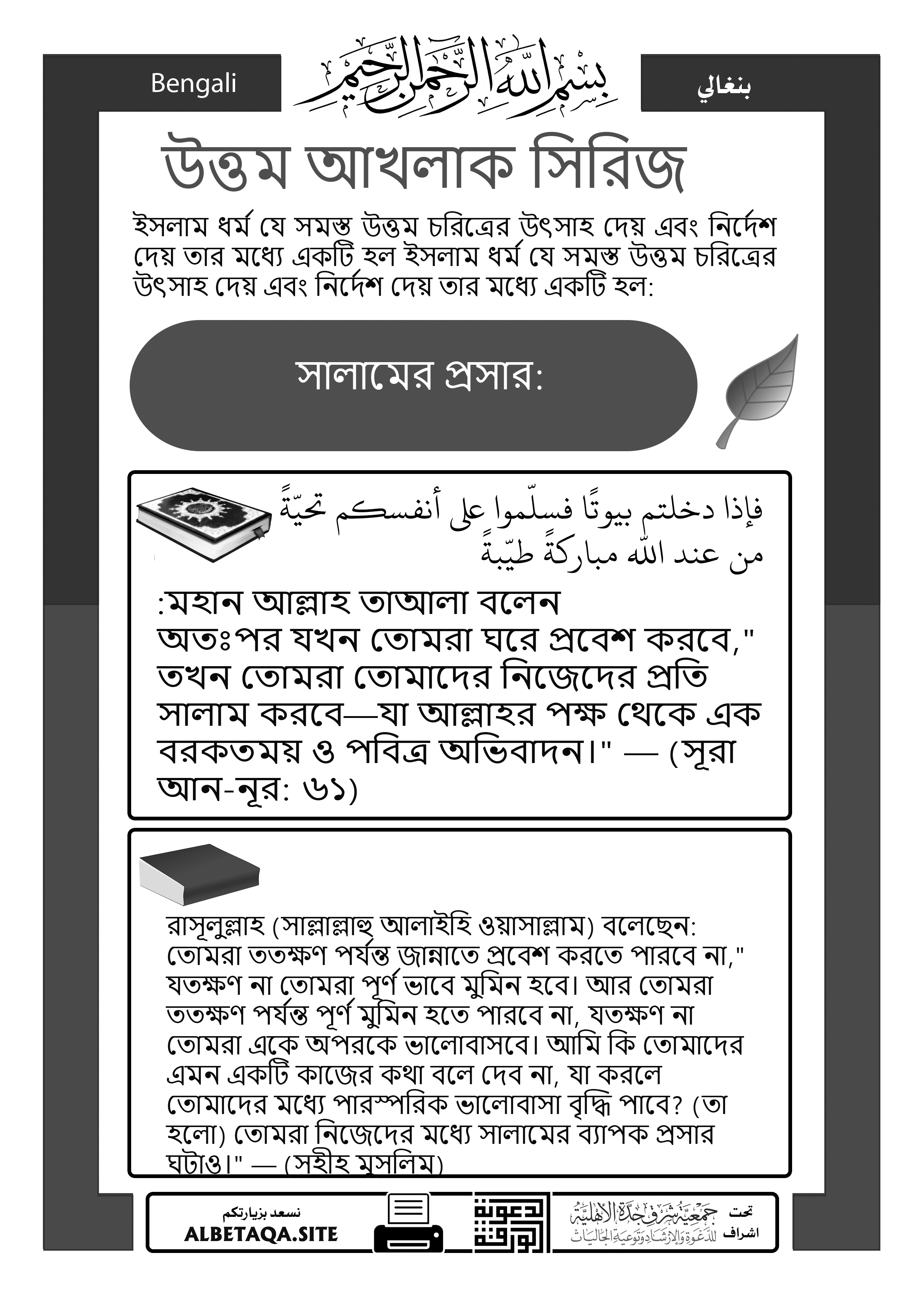 “অতঃপর যখন তোমরা ঘরে প্রবেশ করবে, তখন তোমরা তোমাদের নিজেদের প্রতি সালাম করবে—যা আল্লাহর পক্ষ থেকে এক বরকতময় ও পবিত্র অভিবাদন।” — (সূরা আন-নূর: ৬১)
