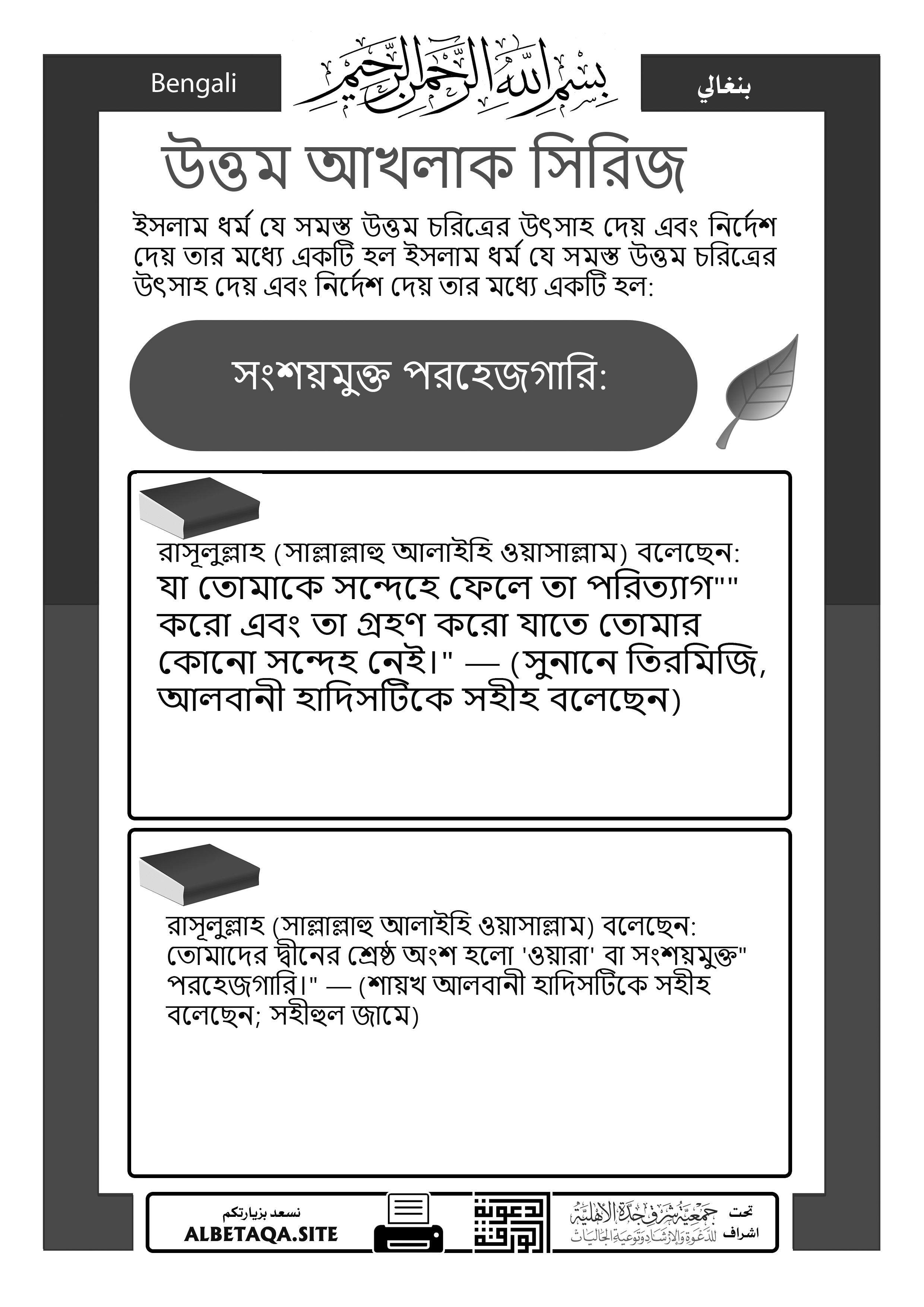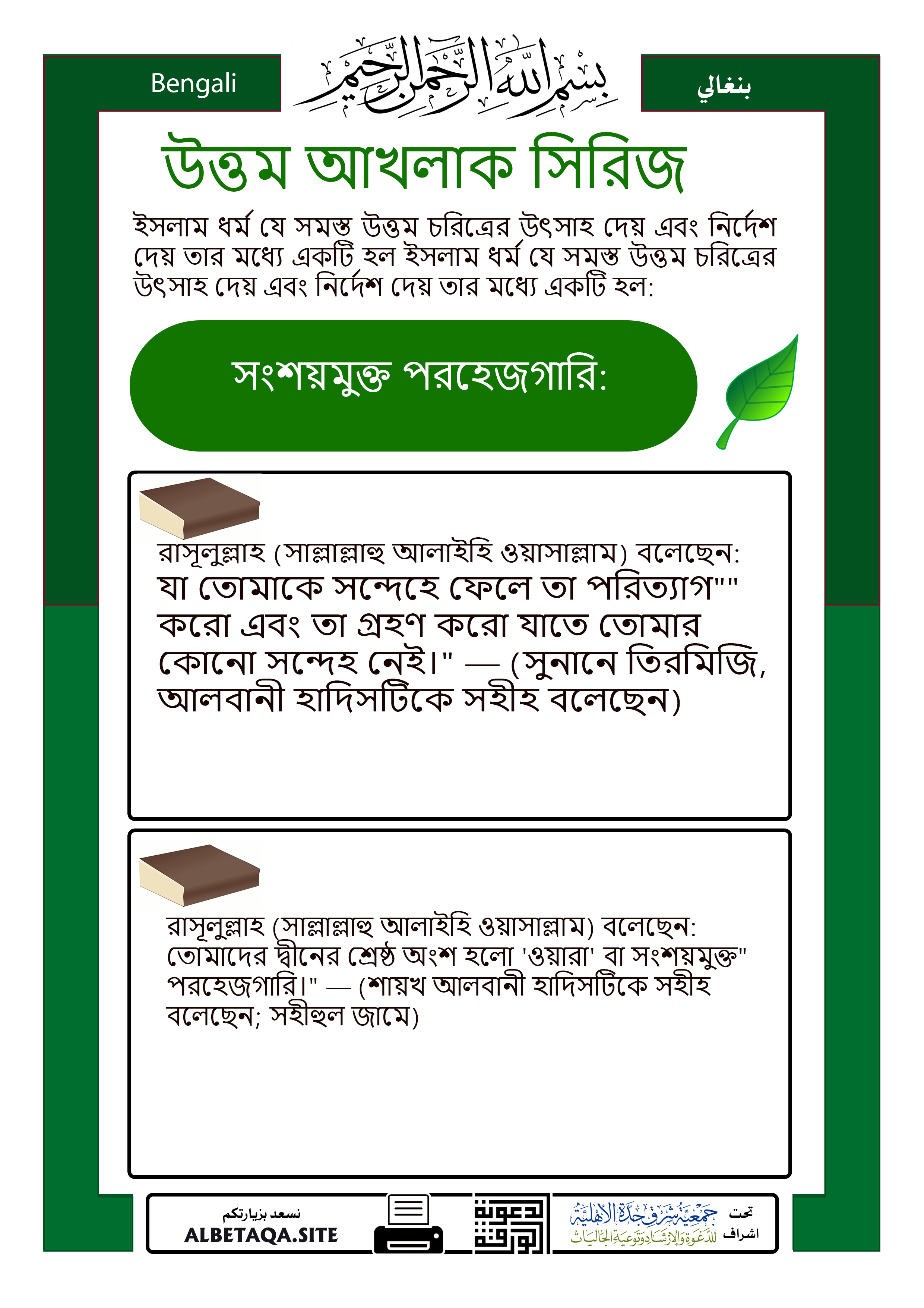 “যা তোমাকে সন্দেহে ফেলে তা পরিত্যাগ করো এবং তা গ্রহণ করো যাতে তোমার কোনো সন্দেহ নেই।” — (সুনানে তিরমিজি, আলবানী হাদিসটিকে সহীহ বলেছেন)