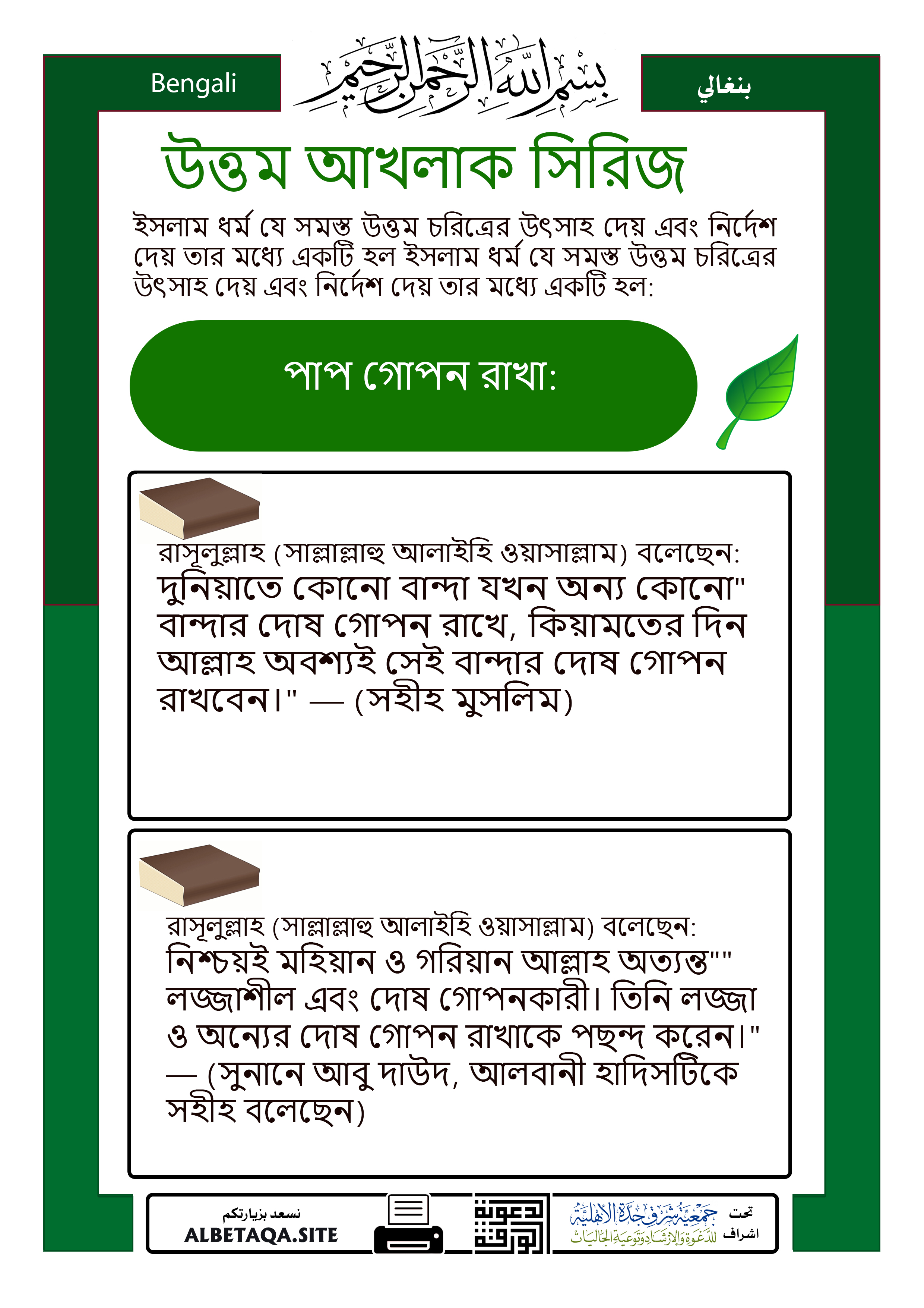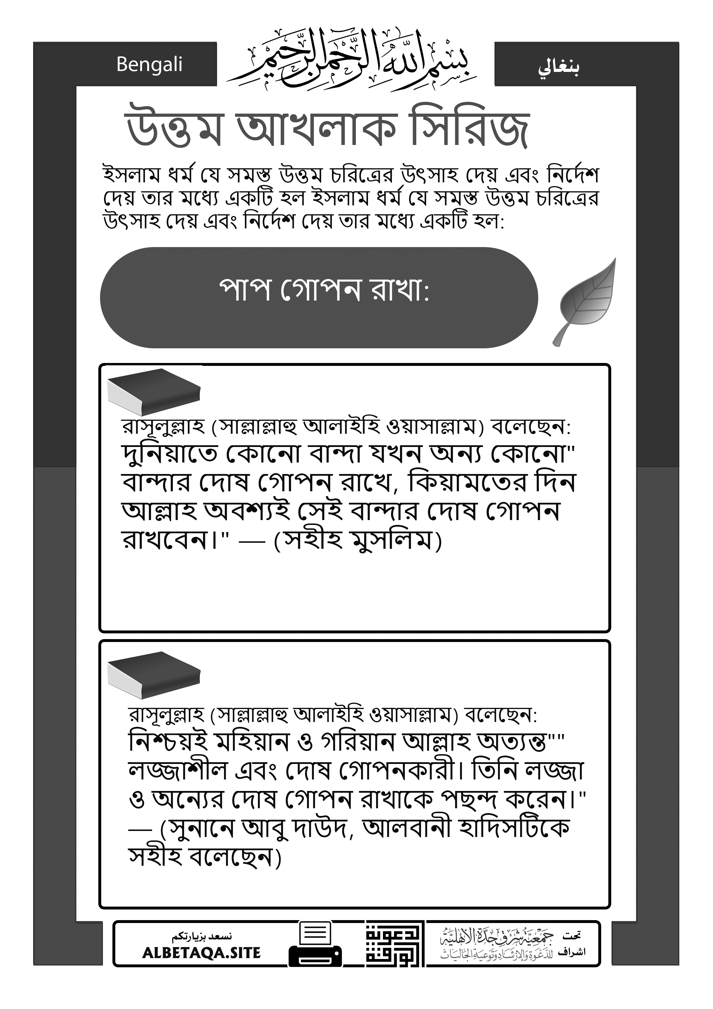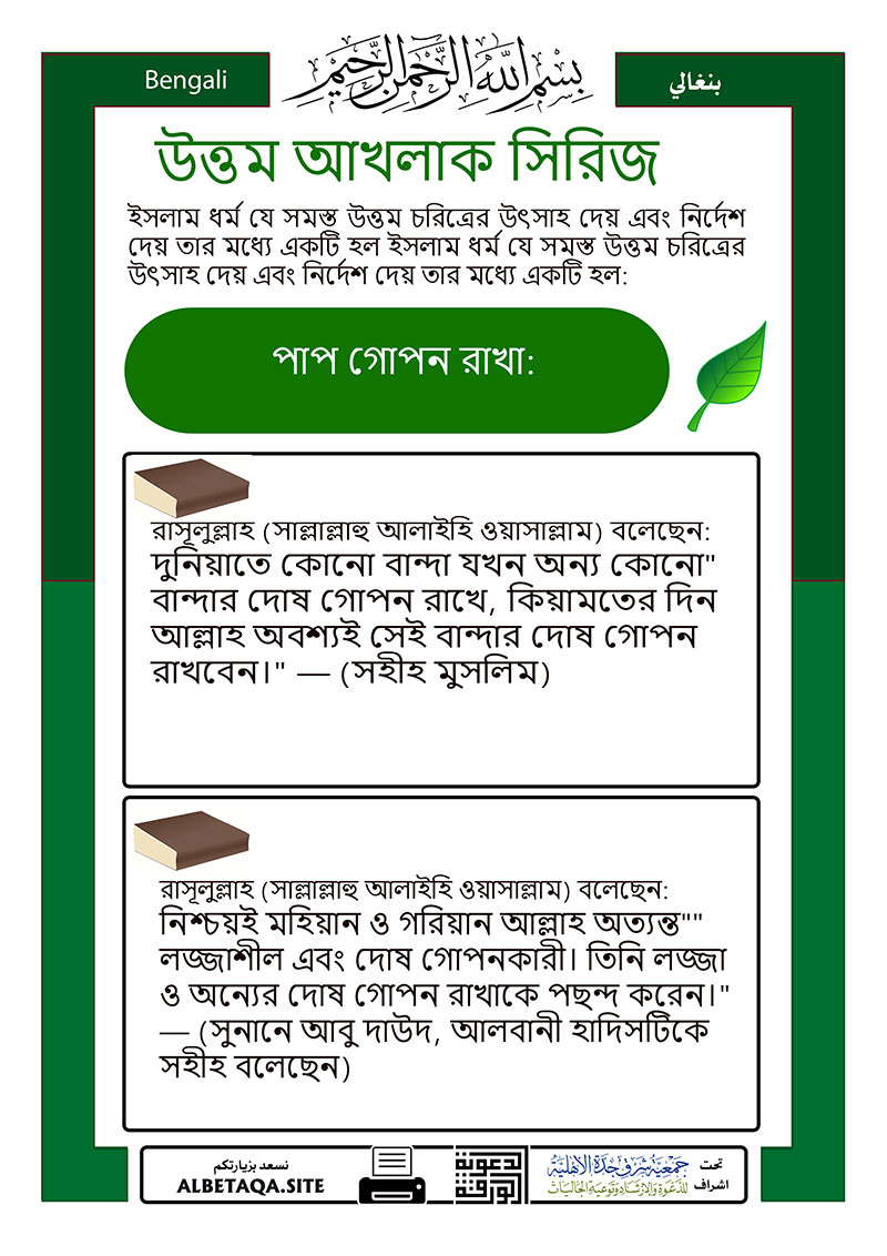 “দুনিয়াতে কোনো বান্দা যখন অন্য কোনো বান্দার দোষ গোপন রাখে, কিয়ামতের দিন আল্লাহ অবশ্যই সেই বান্দার দোষ গোপন রাখবেন।” — (সহীহ মুসলিম)