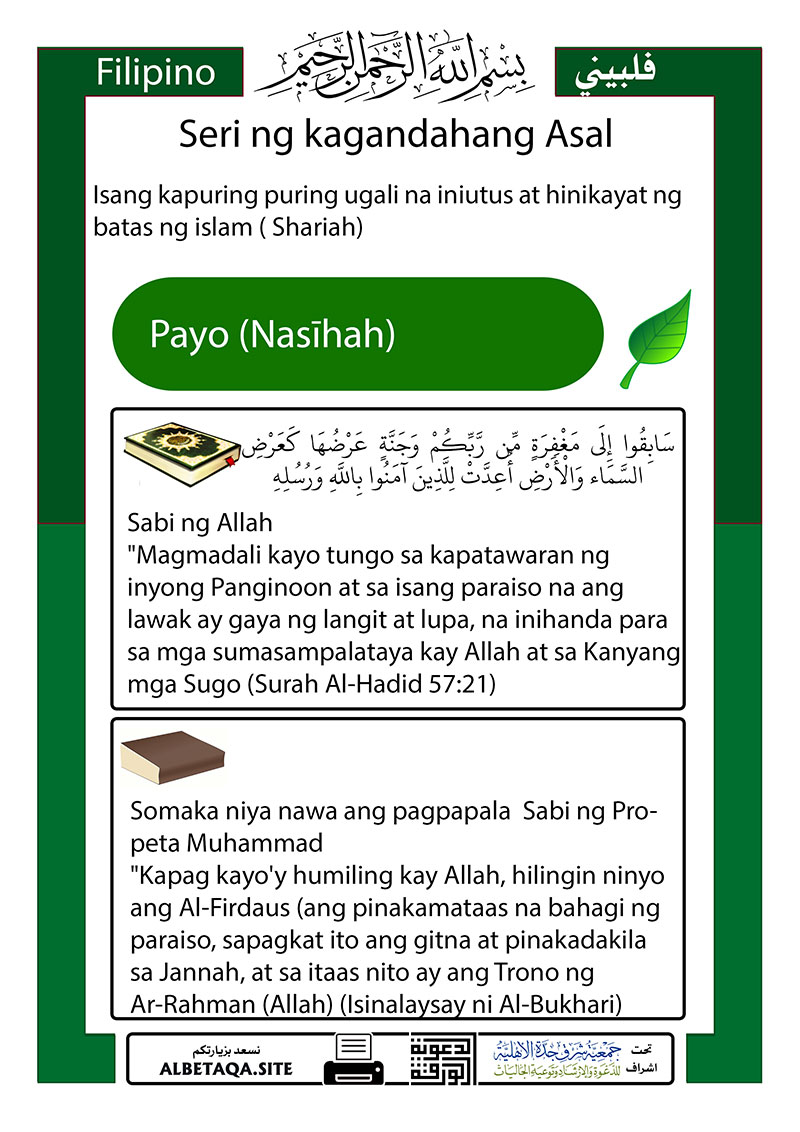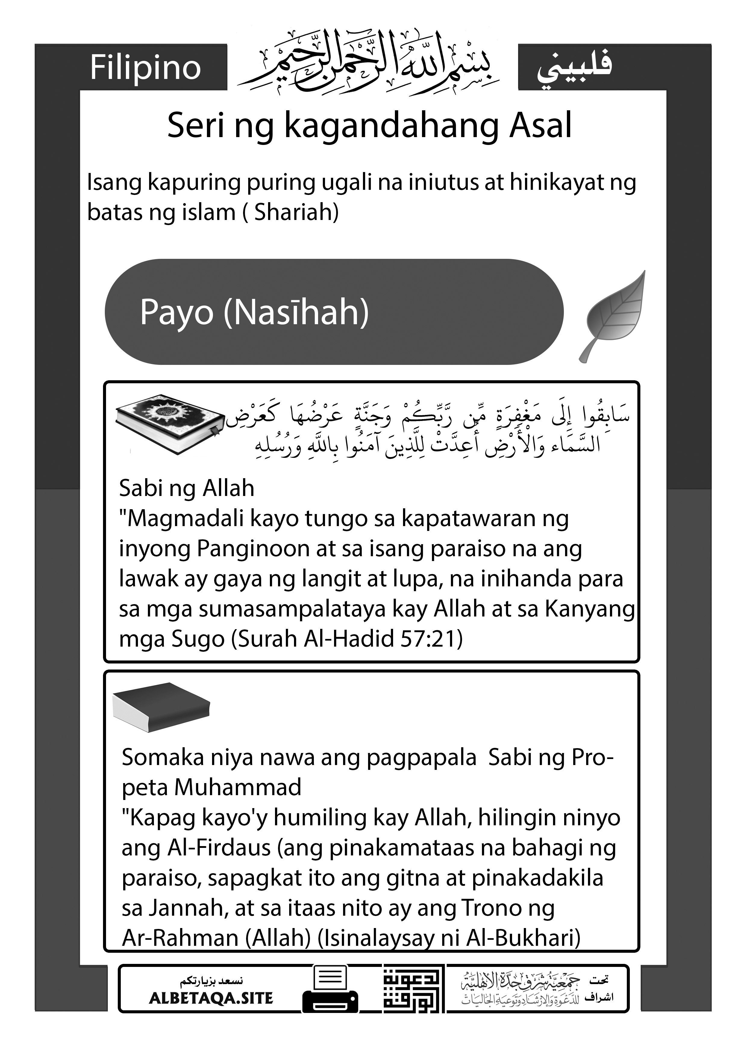 “Magmadali kayo tungo sa kapatawaran ng inyong Panginoon at sa isang paraiso na ang lawak ay gaya ng langit at lupa, na inihanda para sa mga sumasampalataya kay Allah at sa Kanyang mga Sugo