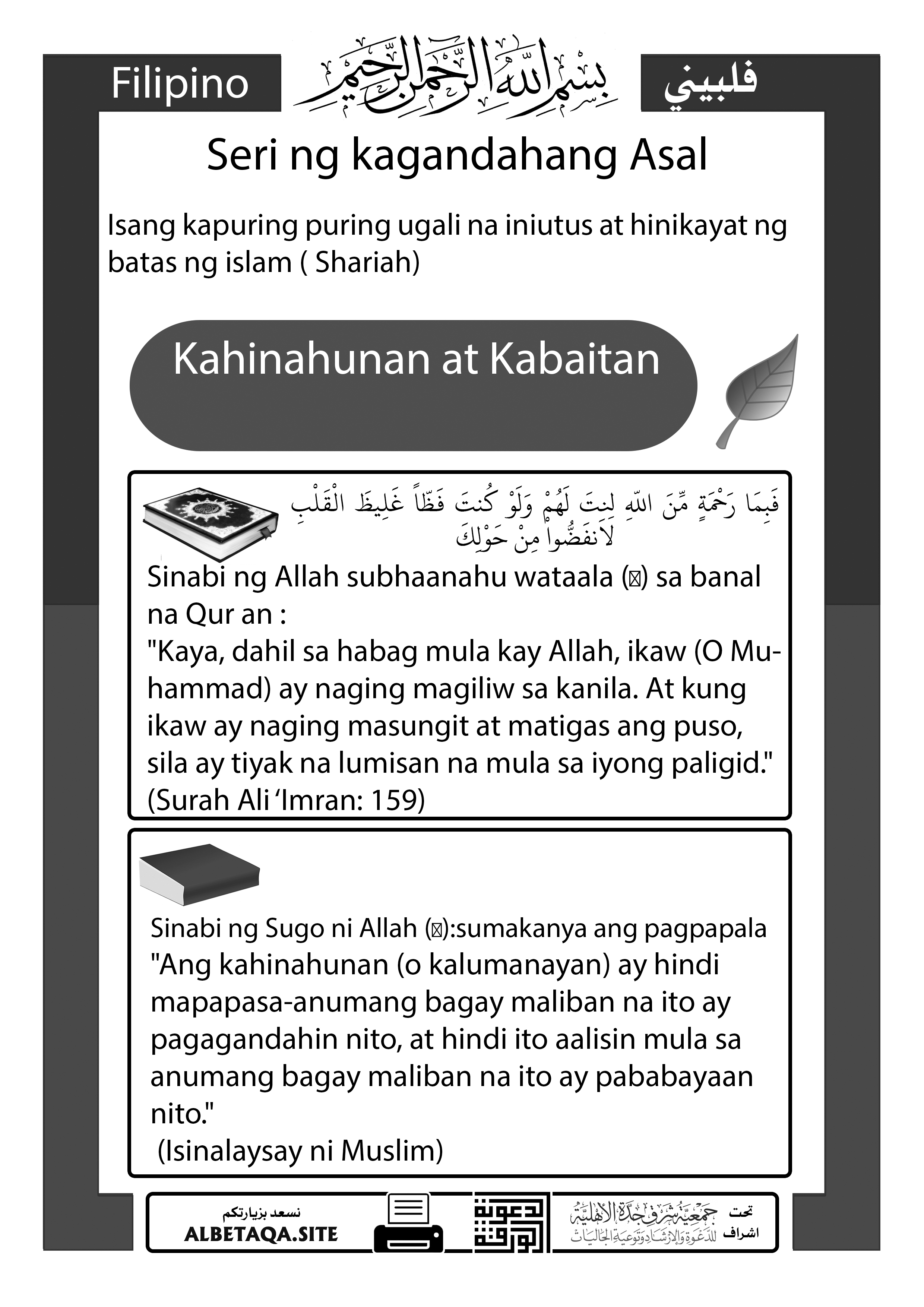 “Kaya, dahil sa habag mula kay Allah, ikaw (O Muhammad) ay naging magiliw sa kanila. At kung ikaw ay naging masungit at matigas ang puso, sila ay tiyak na lumisan na mula sa iyong paligid.”