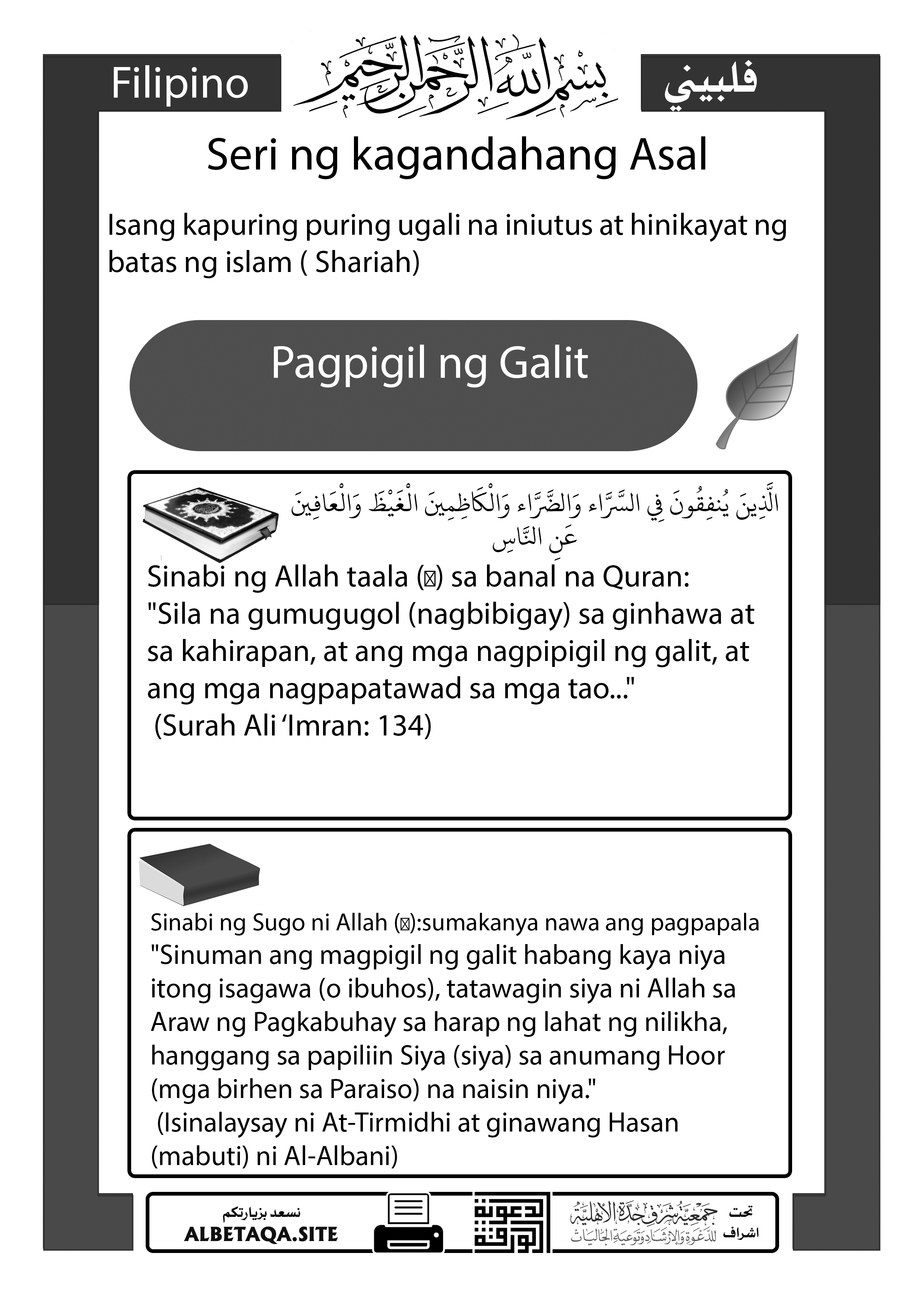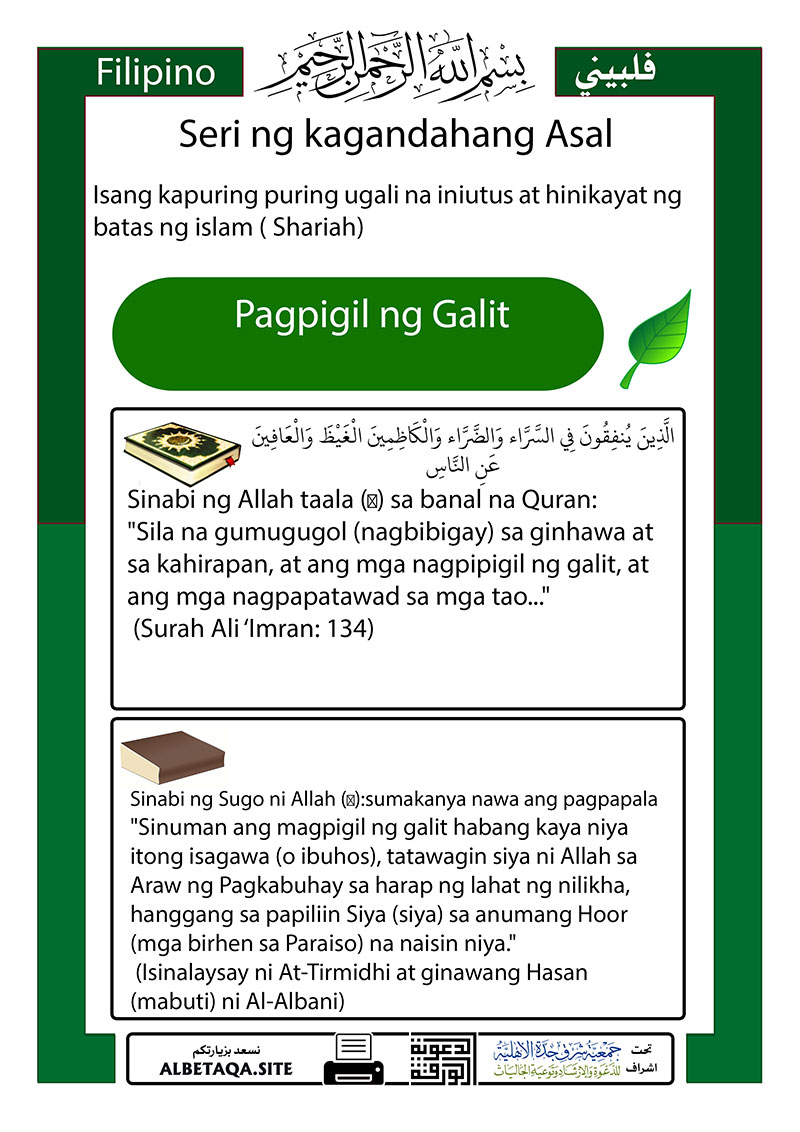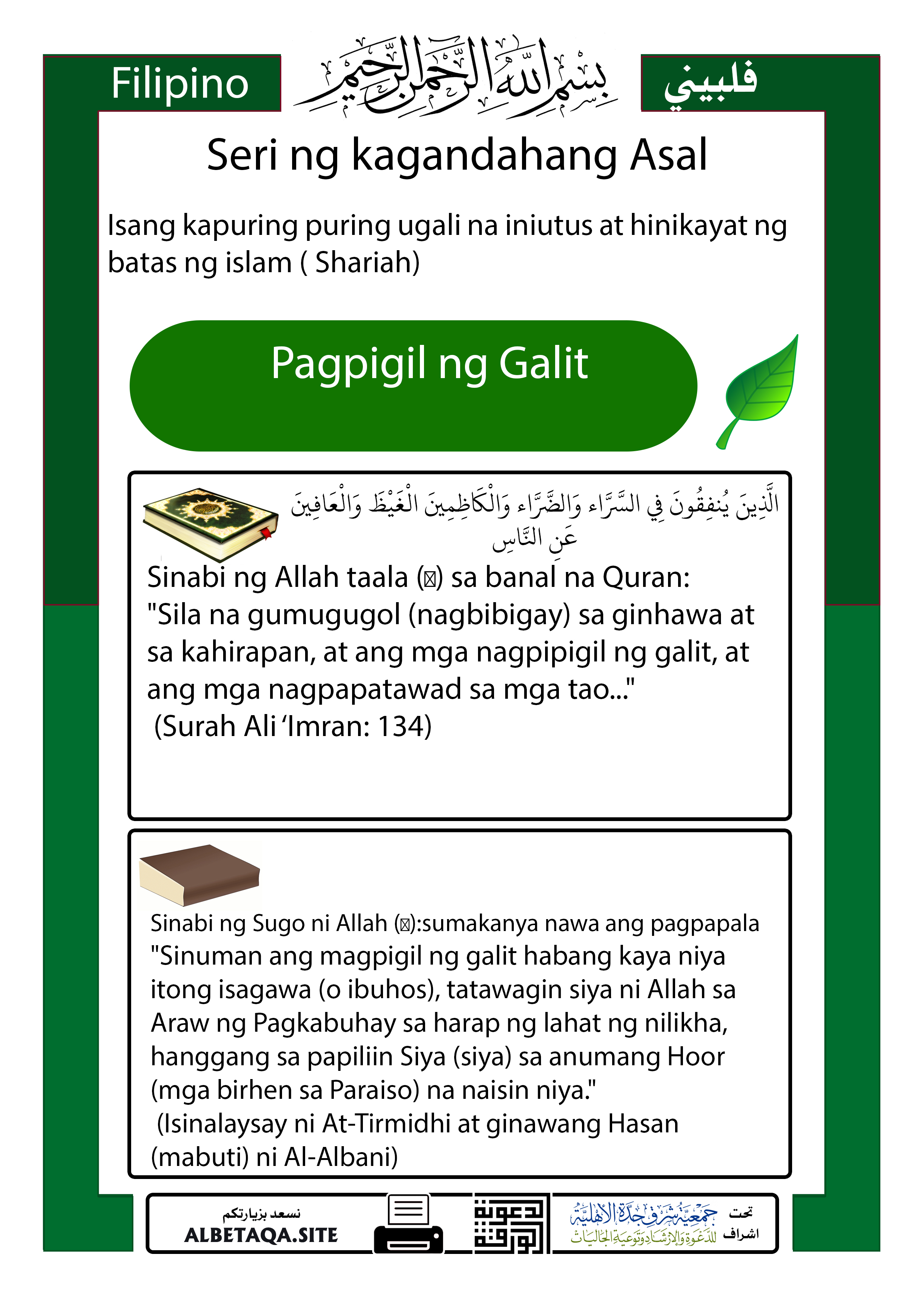 “Sinuman ang magpigil ng galit habang kaya niya itong isagawa (o ibuhos), tatawagin siya ni Allah sa Araw ng Pagkabuhay sa harap ng lahat ng nilikha, hanggang sa papiliin Siya (siya) sa anumang Hoor (mga birhen sa Paraiso) na naisin niya.”