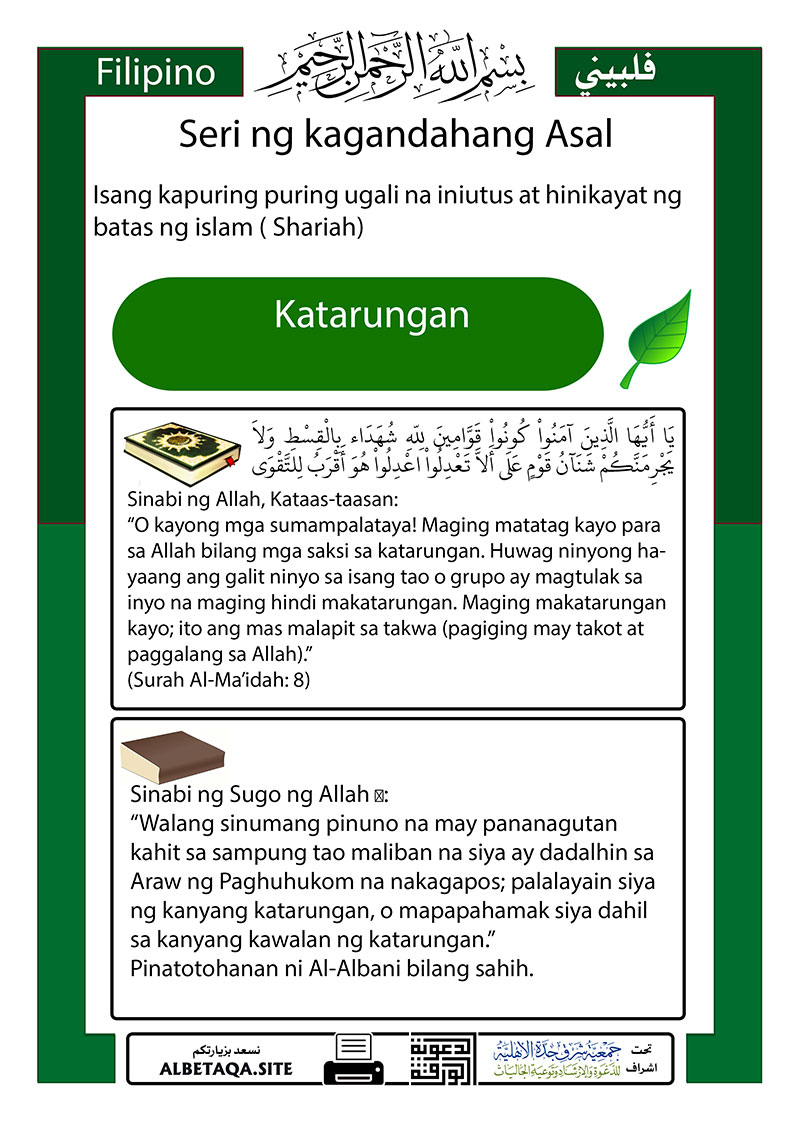 “O kayong mga sumampalataya! Maging matatag kayo para sa Allah bilang mga saksi sa katarungan. Huwag ninyong hayaang ang galit ninyo sa isang tao o grupo ay magtulak sa inyo na maging hindi makatarungan. Maging makatarungan kayo; ito ang mas malapit sa takwa (pagiging may takot at paggalang sa Allah).”