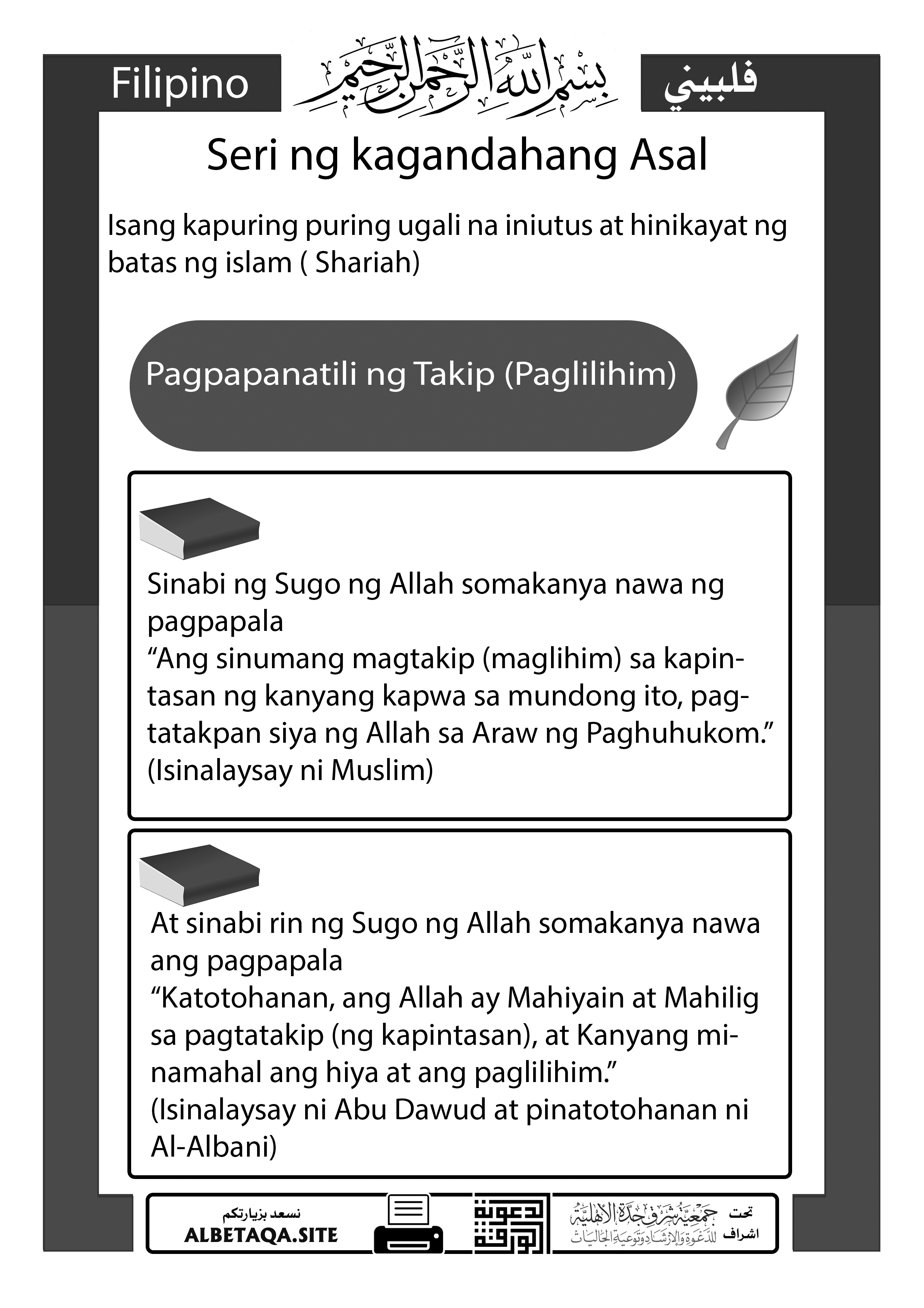 “Ang sinumang magtakip (maglihim) sa kapintasan ng kanyang kapwa sa mundong ito, pagtatakpan siya ng Allah sa Araw ng Paghuhukom.”
