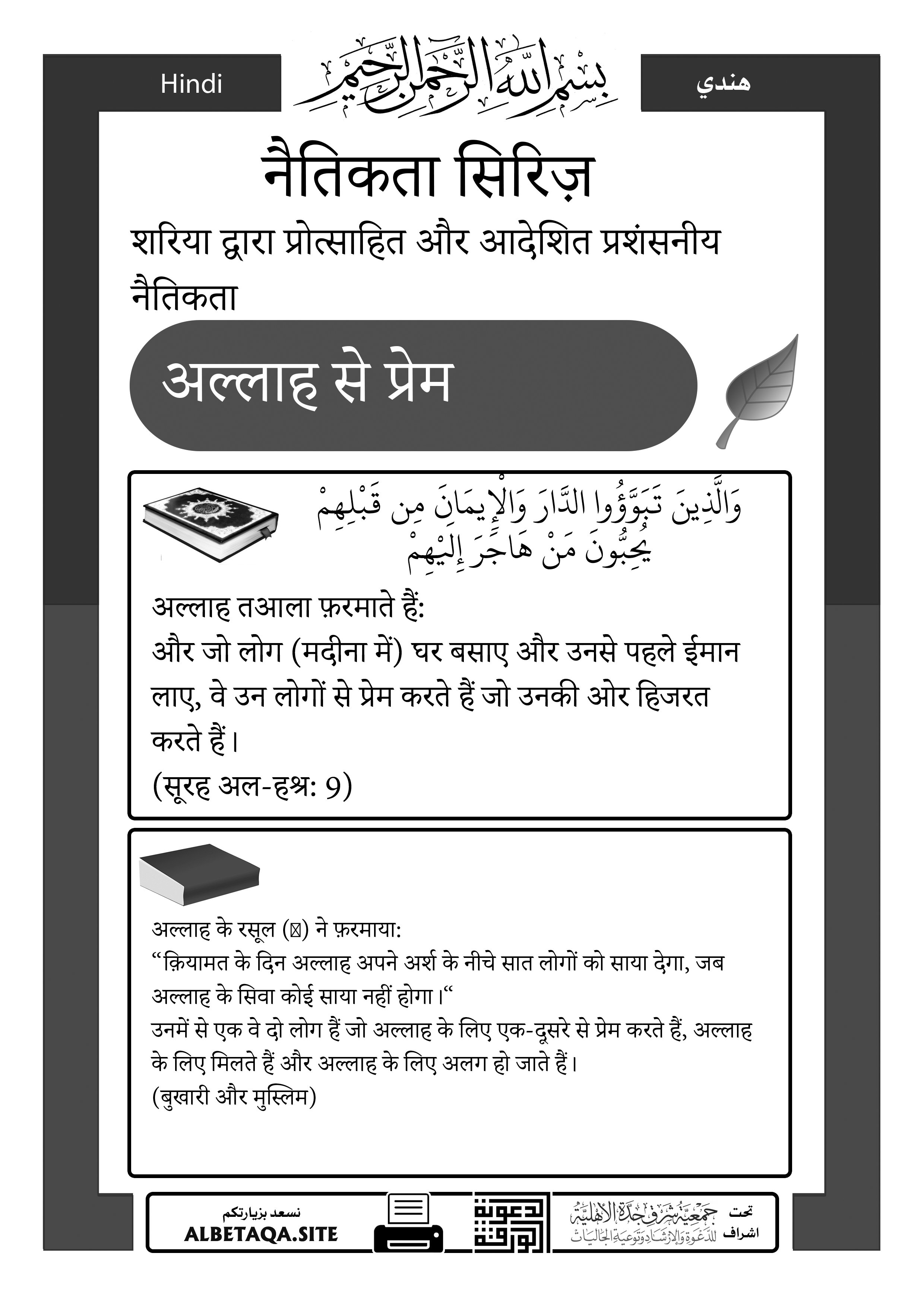 उनमें से एक वे दो लोग हैं जो अल्लाह के लिए एक-दूसरे से प्रेम करते हैं, अल्लाह के लिए मिलते हैं और अल्लाह के लिए अलग हो जाते हैं।