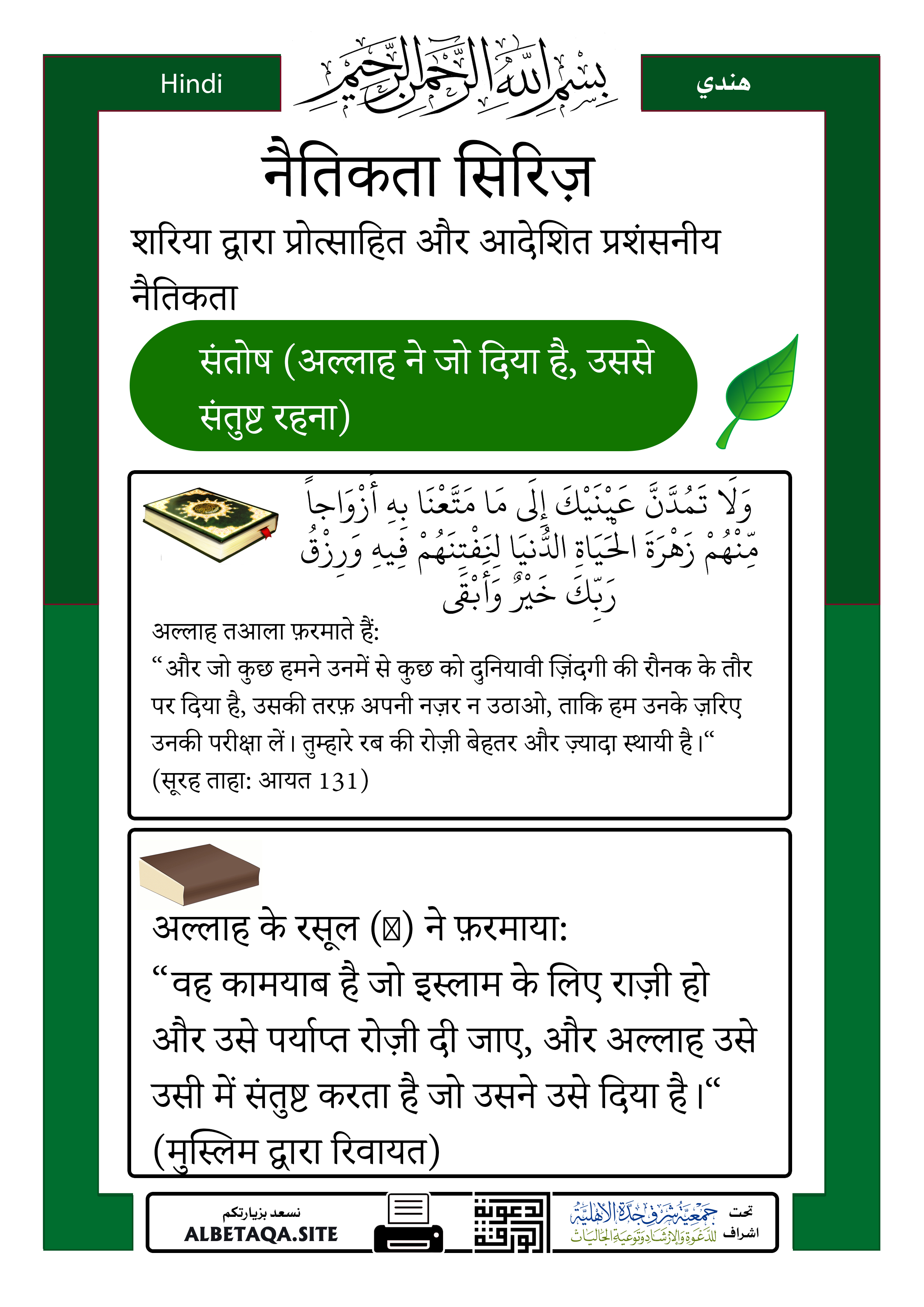 “वह कामयाब है जो इस्लाम के लिए राज़ी हो और उसे पर्याप्त रोज़ी दी जाए, और अल्लाह उसे उसी में संतुष्ट करता है जो उसने उसे दिया है।“ (मुस्लिम द्वारा रिवायत)