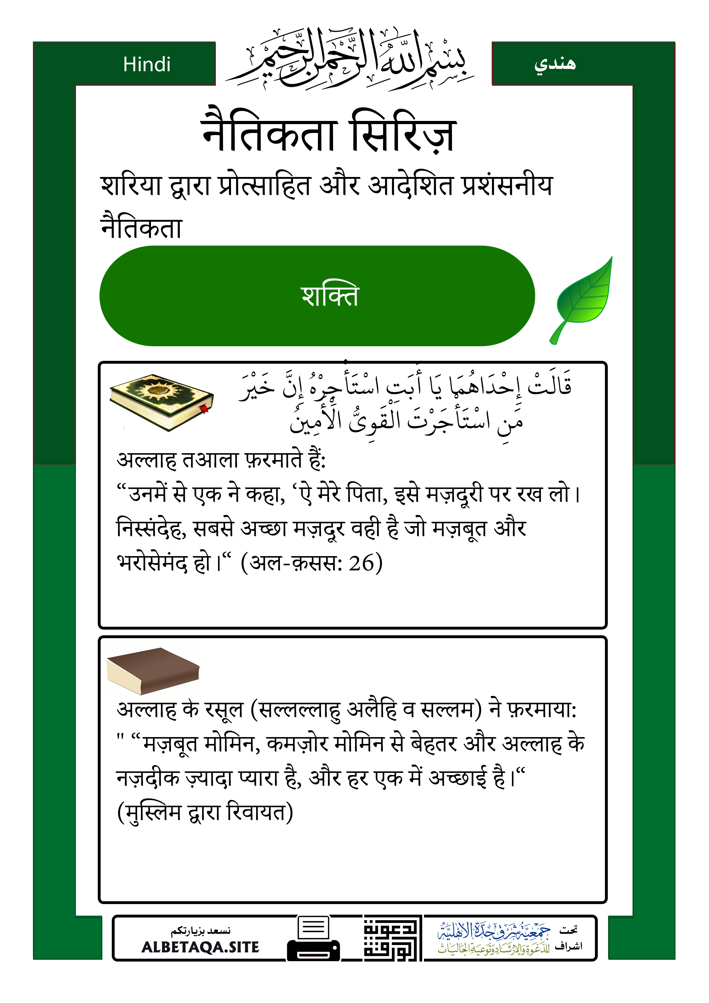 “المؤمن القوي خير وأحب إلى الله من المؤمن الضعيف ، وفي كل خير” “मज़बूत मोमिन, कमज़ोर मोमिन से बेहतर और अल्लाह के नज़दीक ज़्यादा प्यारा है, और हर एक में अच्छाई है।“ (मुस्लिम द्वारा रिवायत)