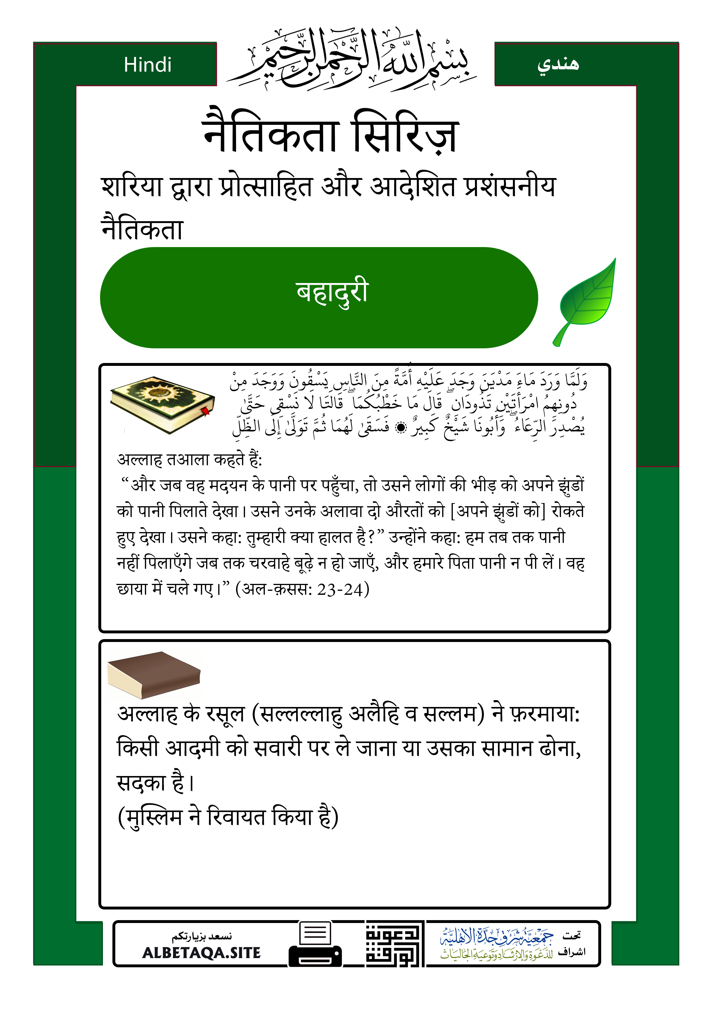 “और जब वह मदयन के पानी पर पहुँचा, तो उसने लोगों की भीड़ को अपने झुंडों को पानी पिलाते देखा। उसने उनके अलावा दो औरतों को [अपने झुंडों को] रोकते हुए देखा। उसने कहा: तुम्हारी क्या हालत है?” उन्होंने कहा: हम तब तक पानी नहीं पिलाएँगे जब तक चरवाहे बूढ़े न हो जाएँ, और हमारे पिता पानी न पी लें। वह छाया में चले गए।” (अल-क़सस: 23-24)