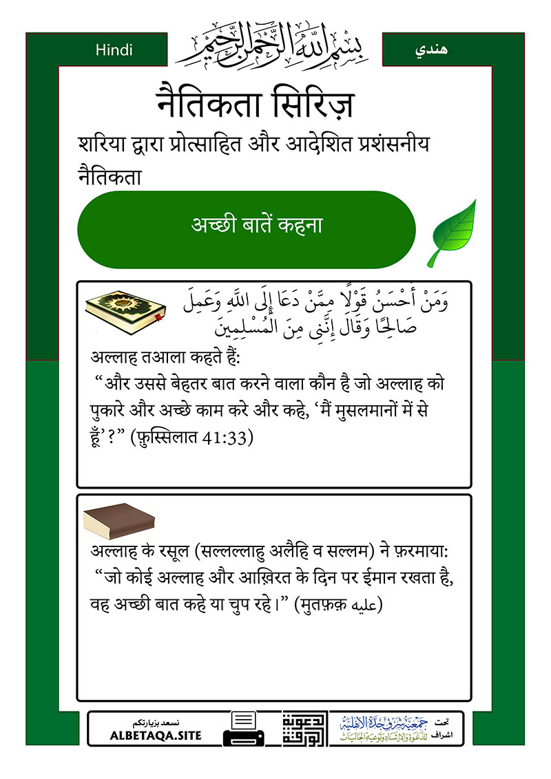 “जो कोई अल्लाह और आख़िरत के दिन पर ईमान रखता है, वह अच्छी बात कहे या चुप रहे।” (मुतफ़क़ عليه)