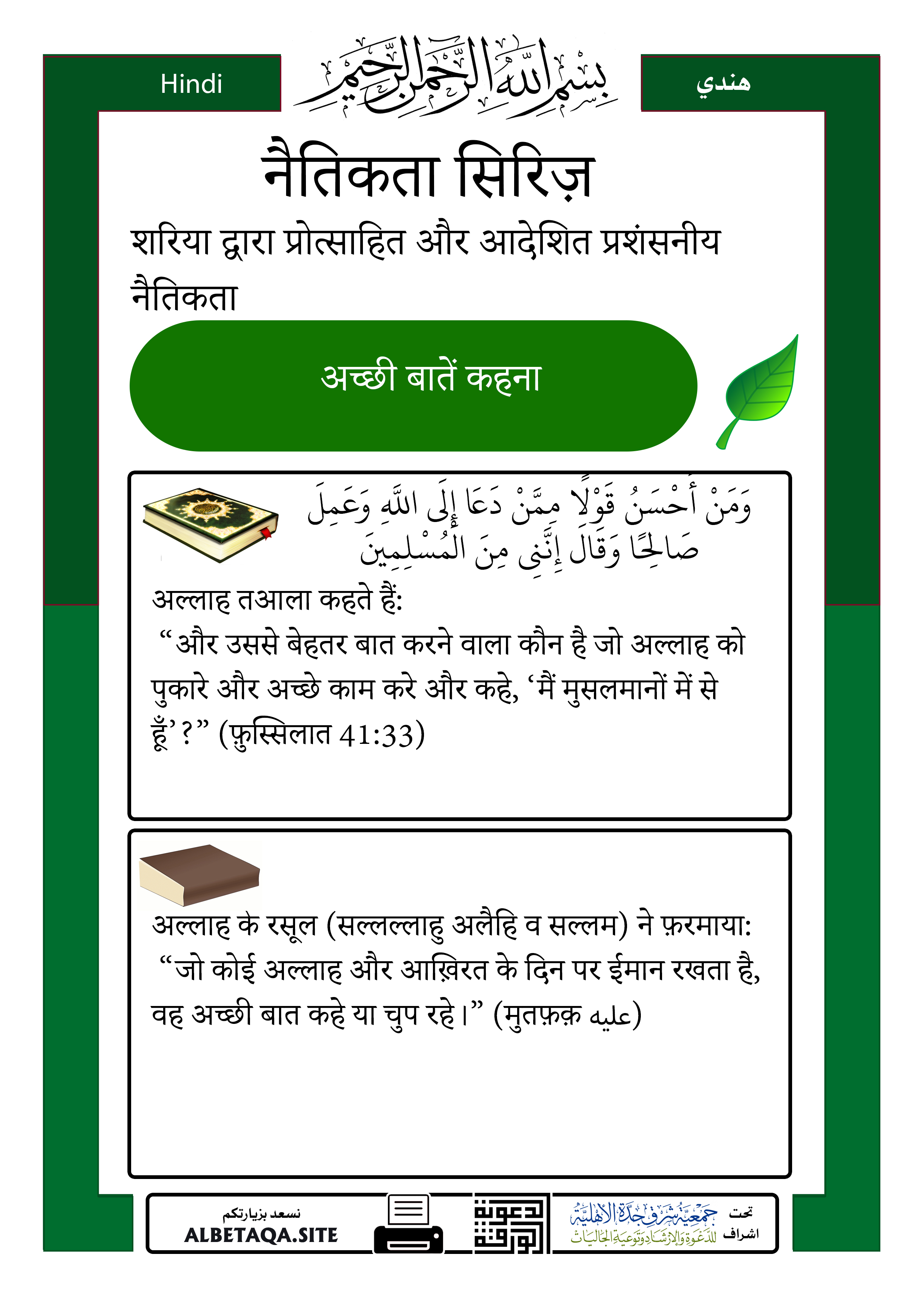 “और उससे बेहतर बात करने वाला कौन है जो अल्लाह को पुकारे और अच्छे काम करे और कहे, ‘मैं मुसलमानों में से हूँ’?” (फ़ुस्सिलात 41:33)