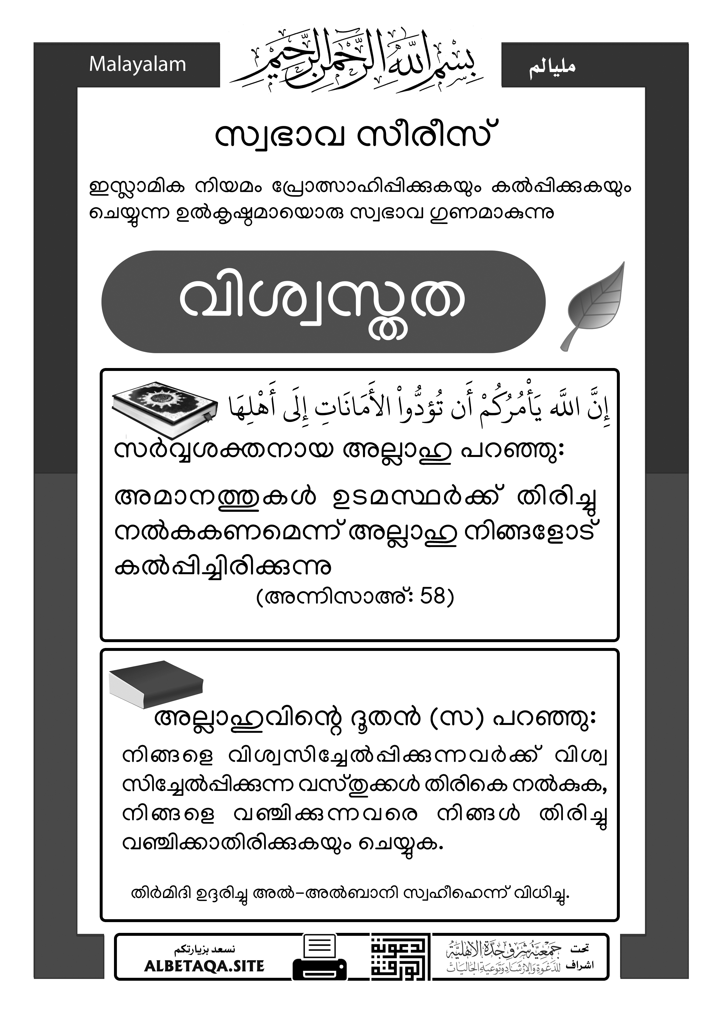 അമാനത്തുകൾ അവ അർഹിക്കുന്നവർക്ക് നൽകണമെന്ന് അല്ലാഹു നിങ്ങളോട് കൽപ്പിച്ചിരിക്കുന്നു