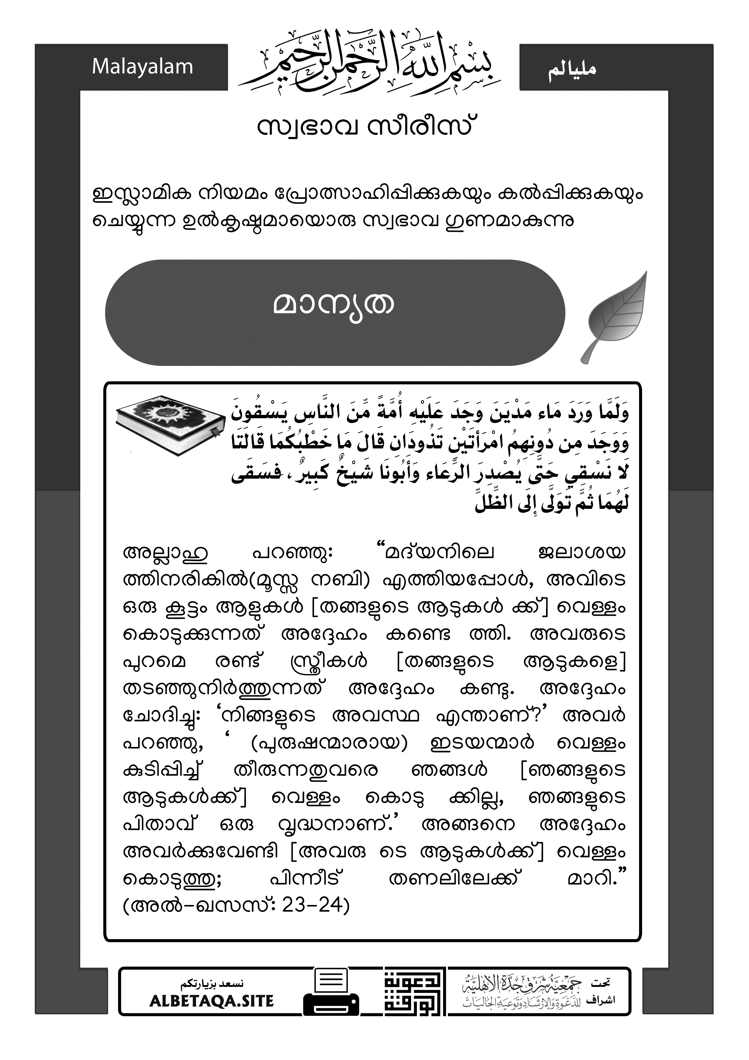 അല്ലാഹു പറഞ്ഞു: “മദ്‌യനിലെ ജലാശയ ത്തിനരികിൽ(മൂസ്സ നബി) എത്തിയപ്പോൾ, അവിടെ ഒരു കൂട്ടം ആളുകൾ [തങ്ങളുടെ ആടുകൾ ക്ക്] വെള്ളം കൊടുക്കുന്നത് അദ്ദേഹം കണ്ടെ ത്തി. അവരുടെ പുറമെ രണ്ട് സ്ത്രീകൾ [തങ്ങളുടെ ആടുകളെ] തടഞ്ഞുനിർത്തുന്നത് അദ്ദേഹം കണ്ടു. അദ്ദേഹം ചോദിച്ചു: ‘നിങ്ങളുടെ അവസ്ഥ എന്താണ്?’ അവർ പറഞ്ഞു, ‘ (പുരുഷന്മാരായ) ഇടയന്മാർ വെള്ളം കുടിപ്പിച്ച് തീരുന്നതുവരെ ഞങ്ങൾ [ഞങ്ങളുടെ ആടുകൾക്ക്] വെള്ളം കൊടു ക്കില്ല, ഞങ്ങളുടെ പിതാവ് ഒരു വൃദ്ധനാണ്.’ അങ്ങനെ അദ്ദേഹം അവർക്കുവേണ്ടി [അവരു ടെ ആടുകൾക്ക്] വെള്ളം കൊടുത്തു; പിന്നീട് തണലിലേക്ക് മാറി.” (അൽ-ഖസസ്: 23-24)