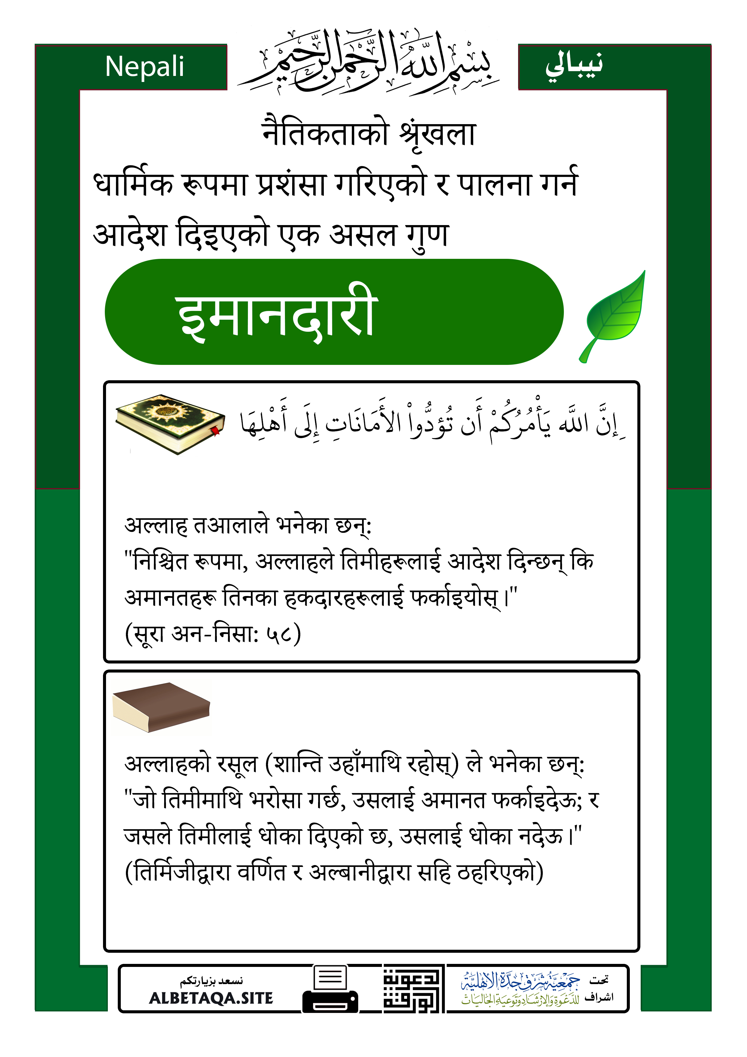 “निश्चित रूपमा, अल्लाहले तिमीहरूलाई आदेश दिन्छन् कि अमानतहरू तिनका हकदारहरूलाई फर्काइयोस्।”