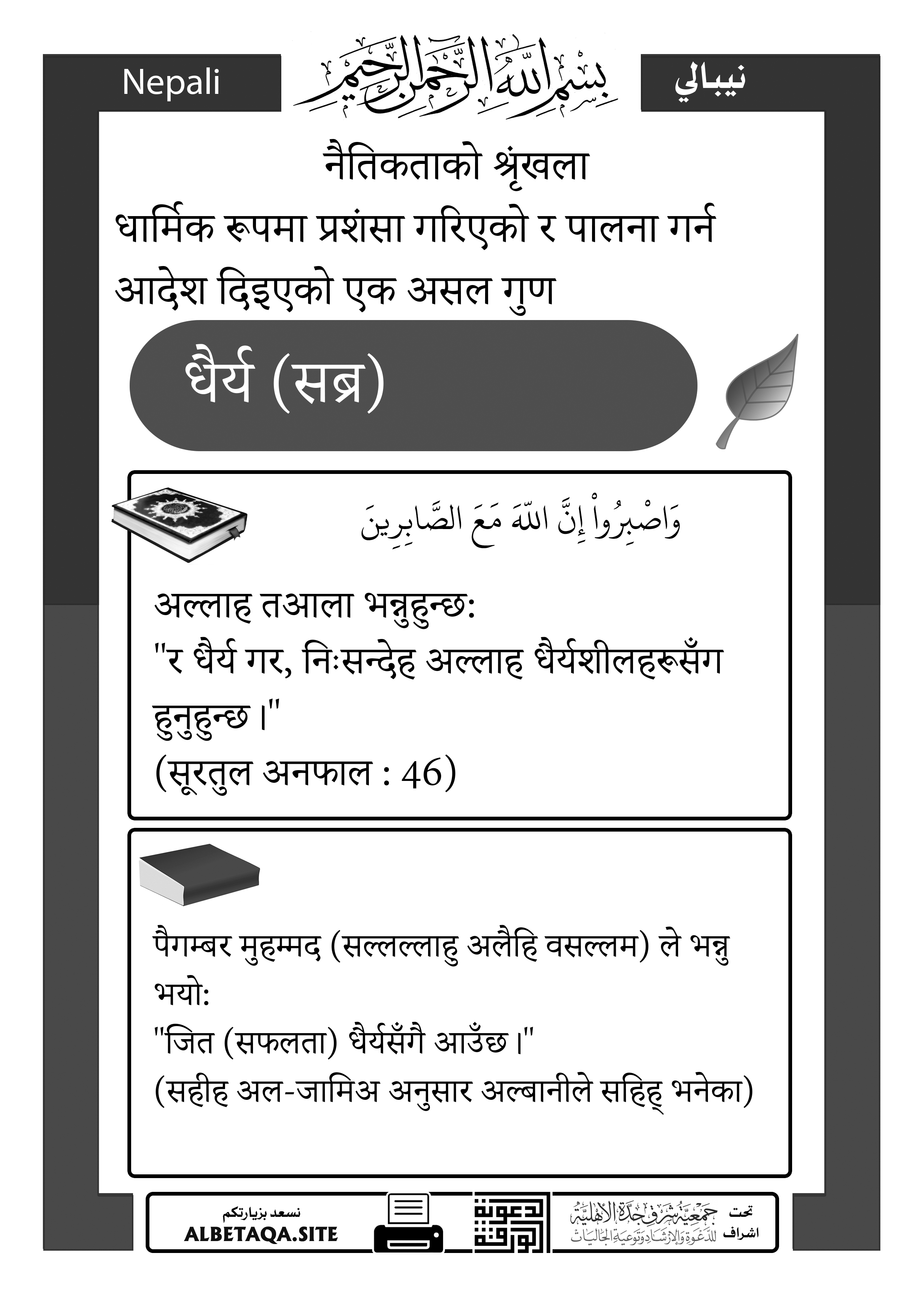“र धैर्य गर, निःसन्देह अल्लाह धैर्यशीलहरूसँग हुनुहुन्छ।”
