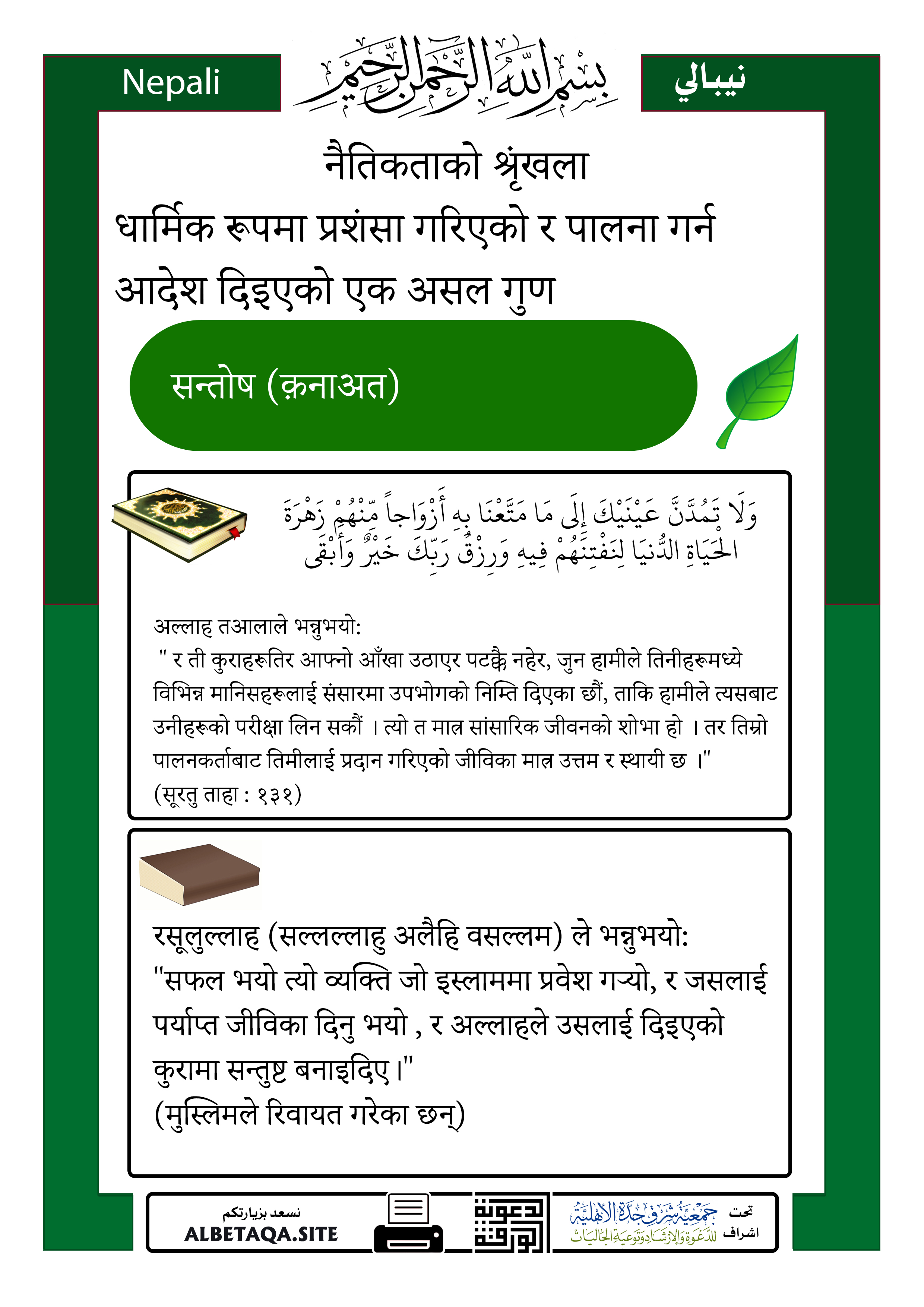 “सफल भयो त्यो व्यक्ति जो इस्लाममा प्रवेश गर्यो, र जसलाई पर्याप्त जीविका दिनु भयो , र अल्लाहले उसलाई दिइएको कुरामा सन्तुष्ट बनाइदिए।”