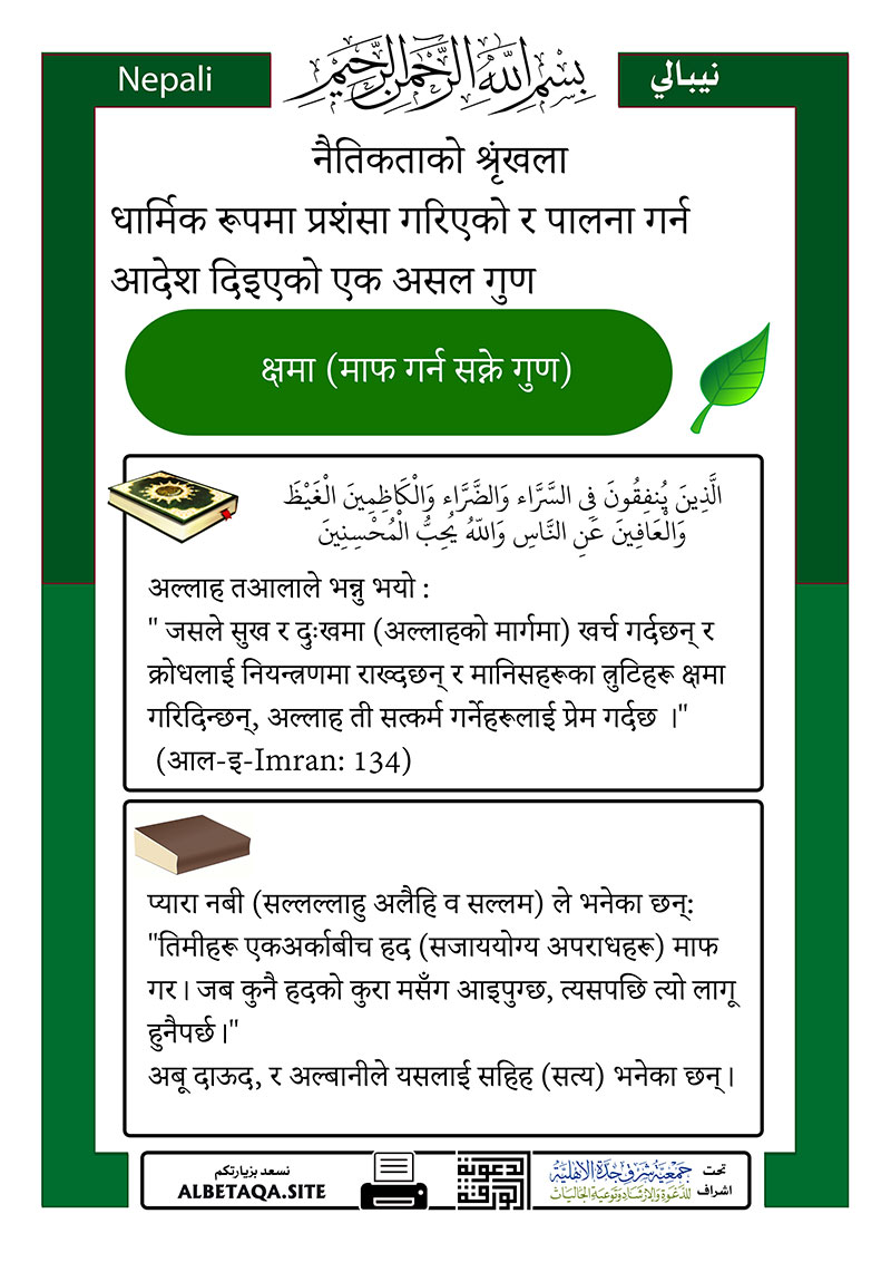 ” जसले सुख र दुःखमा (अल्लाहको मार्गमा) खर्च गर्दछन् र क्रोधलाई नियन्त्रणमा राख्दछन् र मानिसहरूका त्रुटिहरू क्षमा गरिदिन्छन्, अल्लाह ती सत्कर्म गर्नेहरूलाई प्रेम गर्दछ ।”