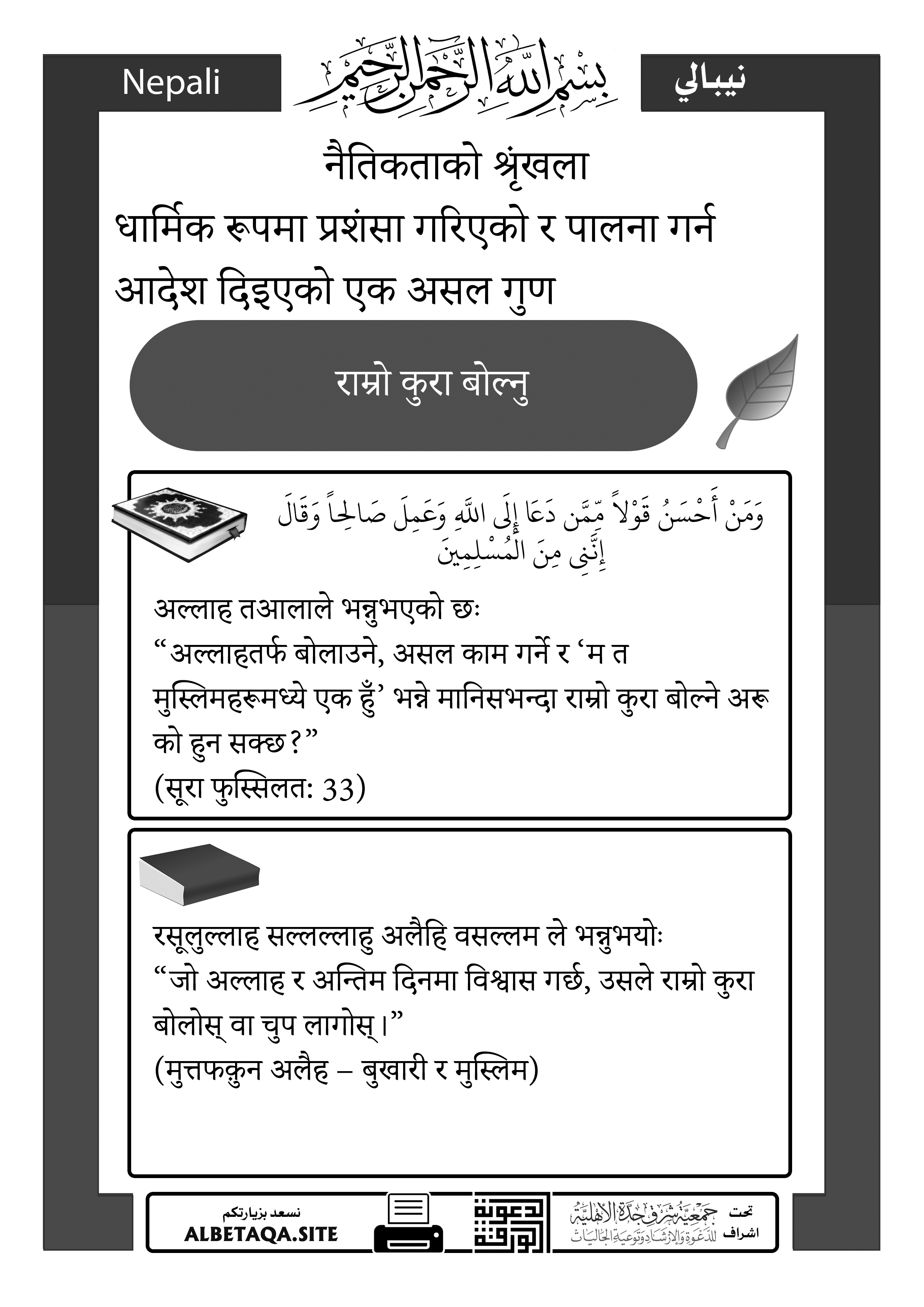 “अल्लाहतर्फ बोलाउने, असल काम गर्ने र ‘म त मुस्लिमहरूमध्ये एक हुँ’ भन्ने मानिसभन्दा राम्रो कुरा बोल्ने अरू को हुन सक्छ?”