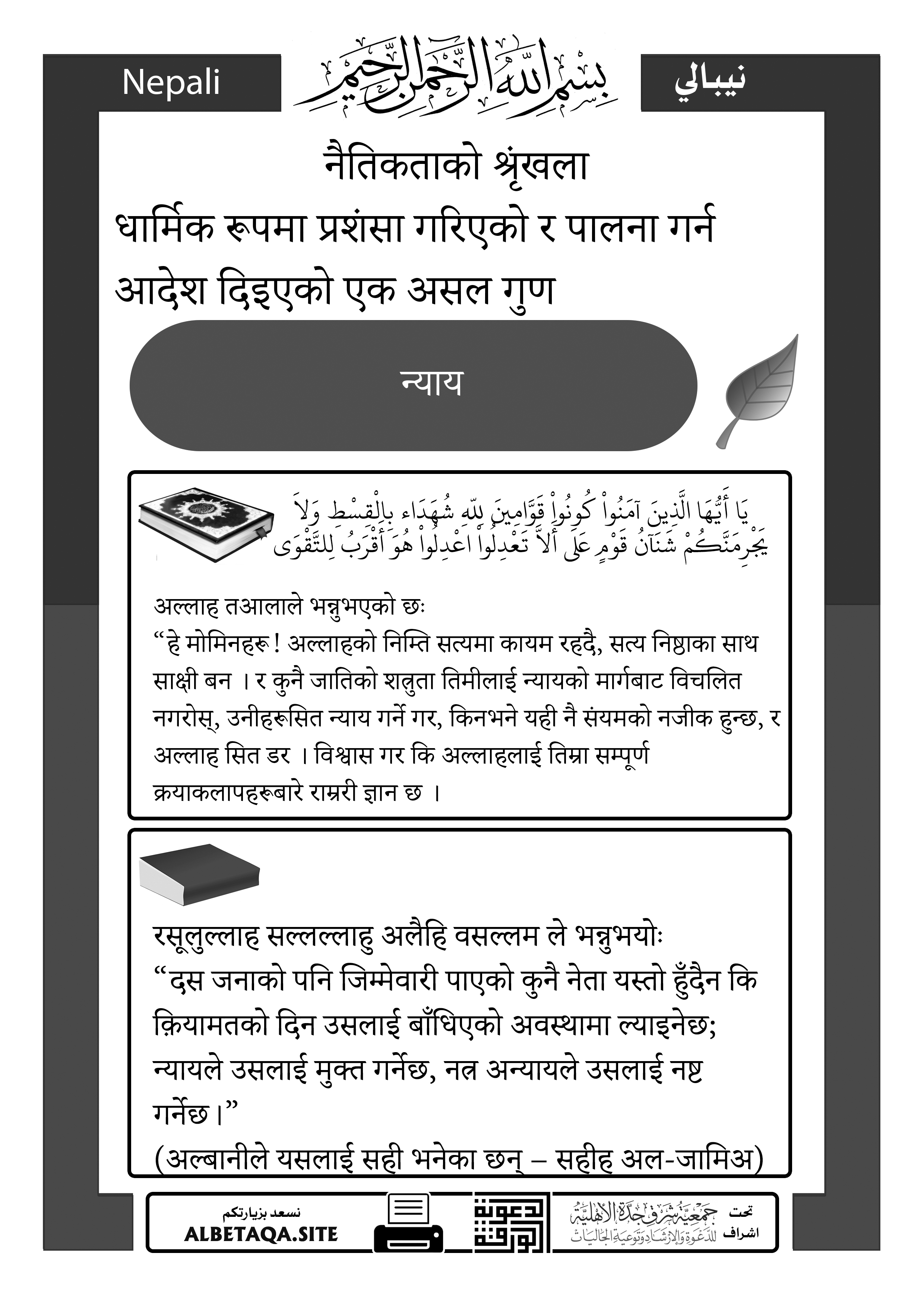 “हे मोमिनहरू! अल्लाहको निम्ति सत्यमा कायम रहदै, सत्य निष्ठाका साथ साक्षी बन । र कुनै जातिको शत्रुता तिमीलाई न्यायको मार्गबाट विचलित नगरोस्, उनीहरूसित न्याय गर्ने गर, किनभने यही नै संयमको नजीक हुन्छ, र अल्लाह सित डर । विश्वास गर कि अल्लाहलाई तिम्रा सम्पूर्ण क्रयाकलापहरूबारे राम्ररी ज्ञान छ ।
