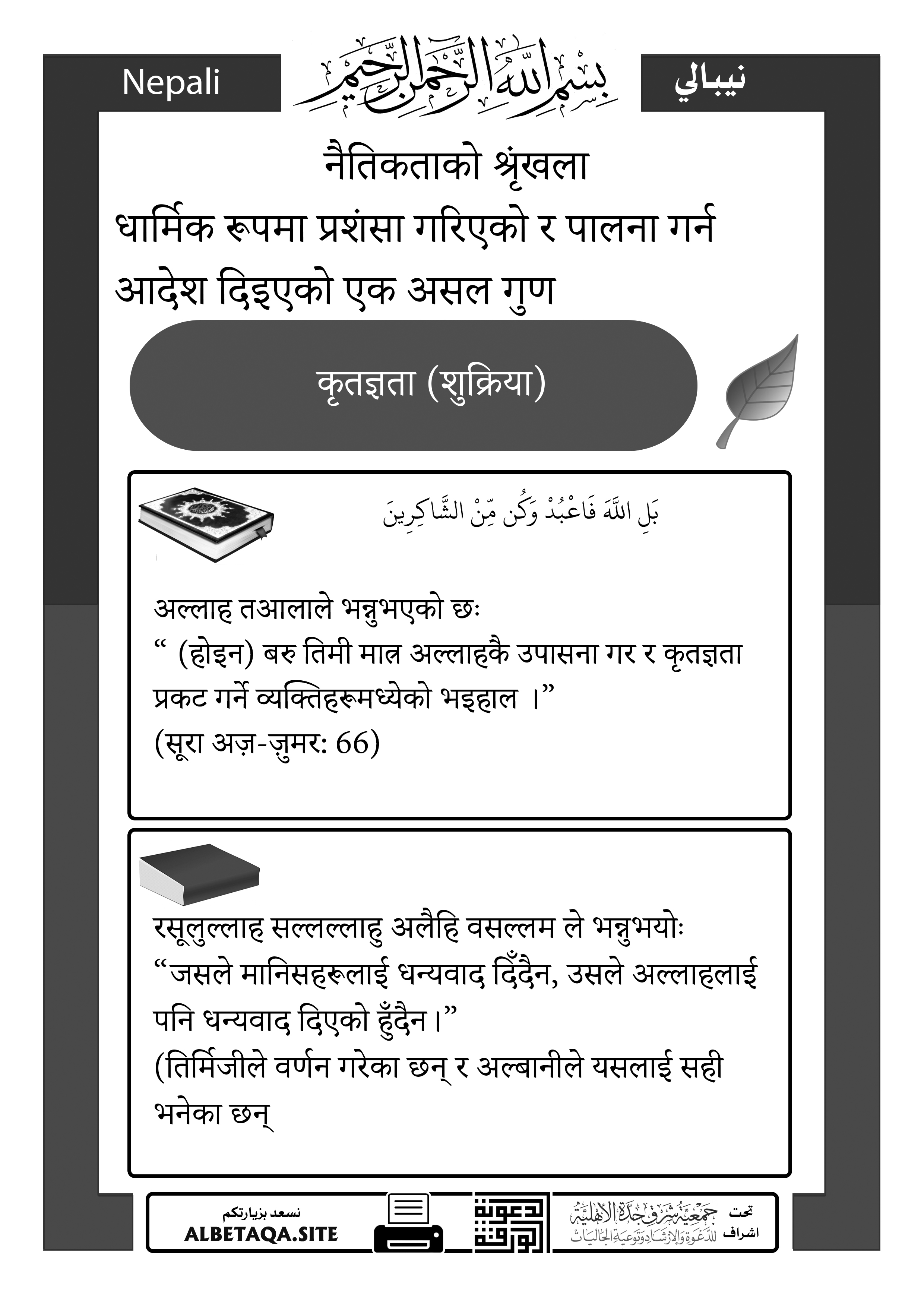 “ (होइन) बरु तिमी मात्र अल्लाहकै उपासना गर र कृतज्ञता प्रकट गर्ने व्यक्तिहरूमध्येको भइहाल ।”