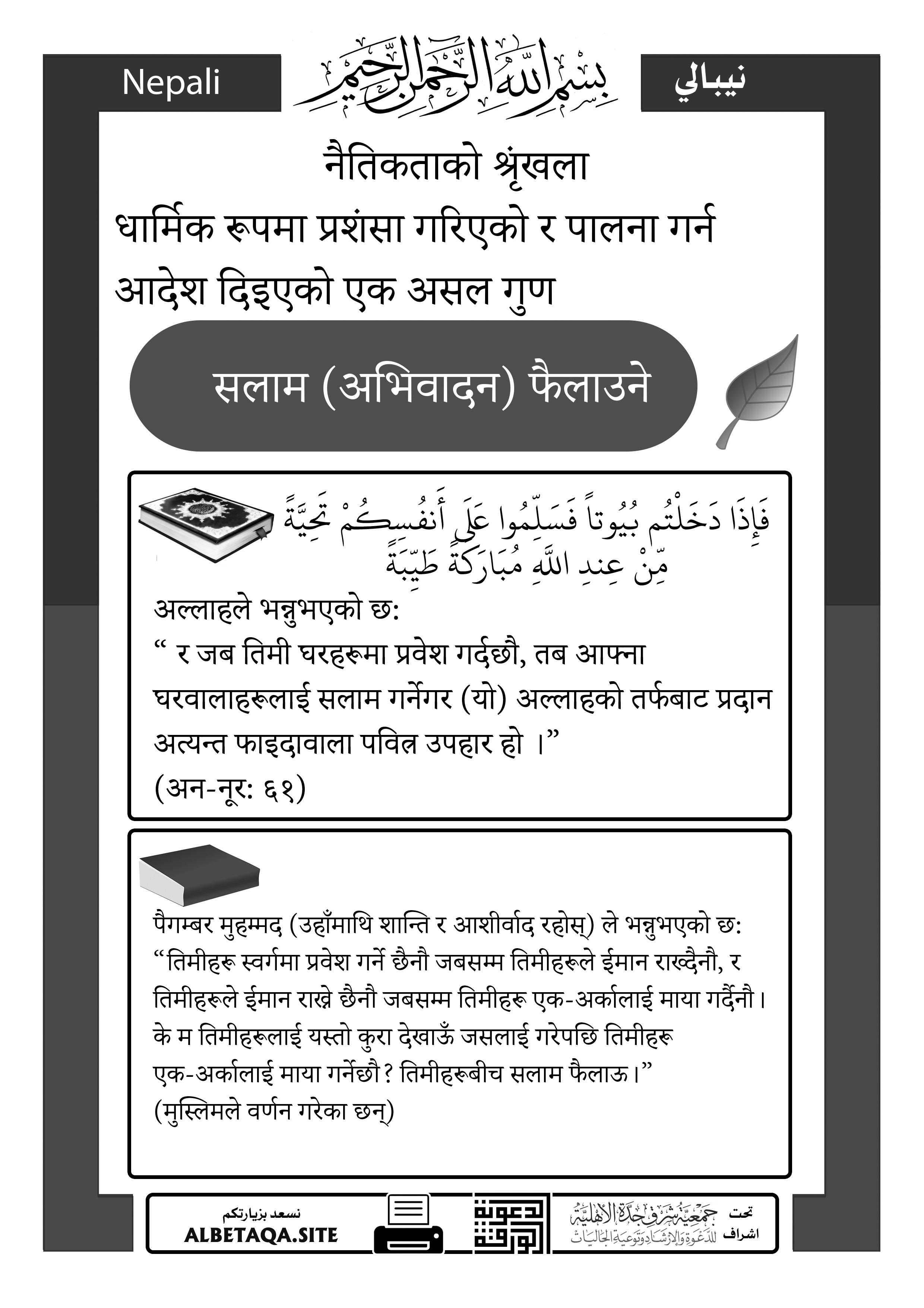 “ र जब तिमी घरहरूमा प्रवेश गर्दछौ, तब आफ्ना घरवालाहरूलाई सलाम गर्नेगर (यो) अल्लाहको तर्फबाट प्रदान अत्यन्त फाइदावाला पवित्र उपहार हो ।”