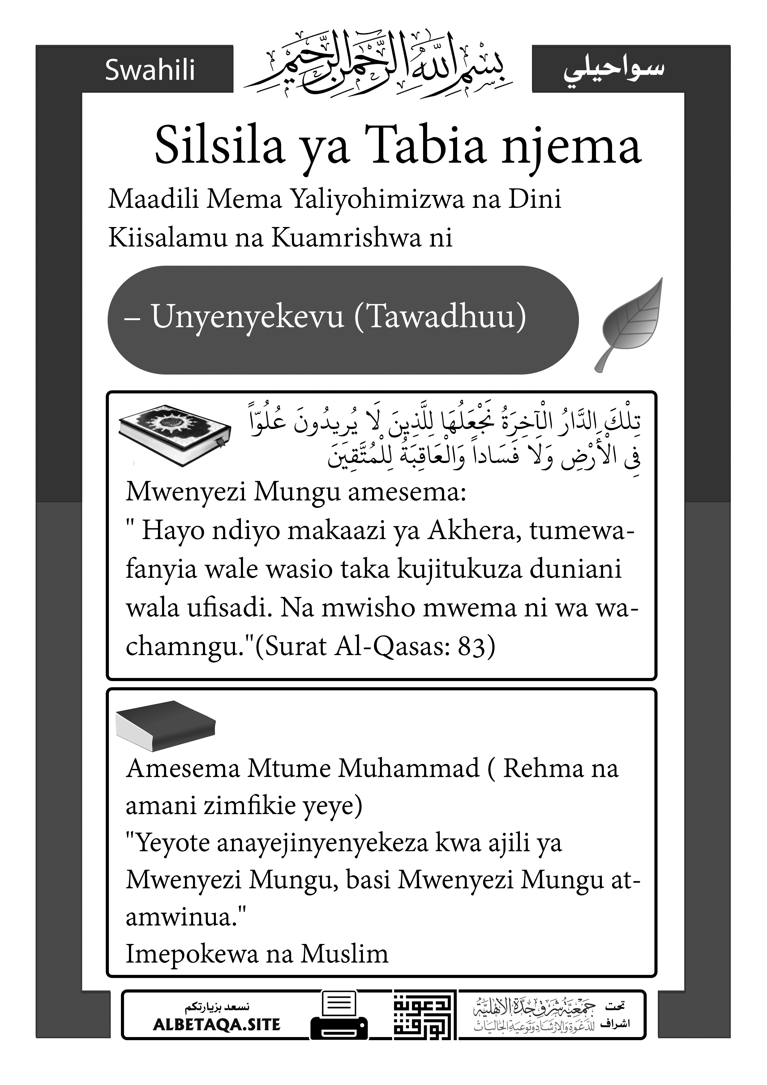 “Yeyote anayejinyenyekeza kwa ajili ya Mwenyezi Mungu, basi Mwenyezi Mungu atamwinua.”