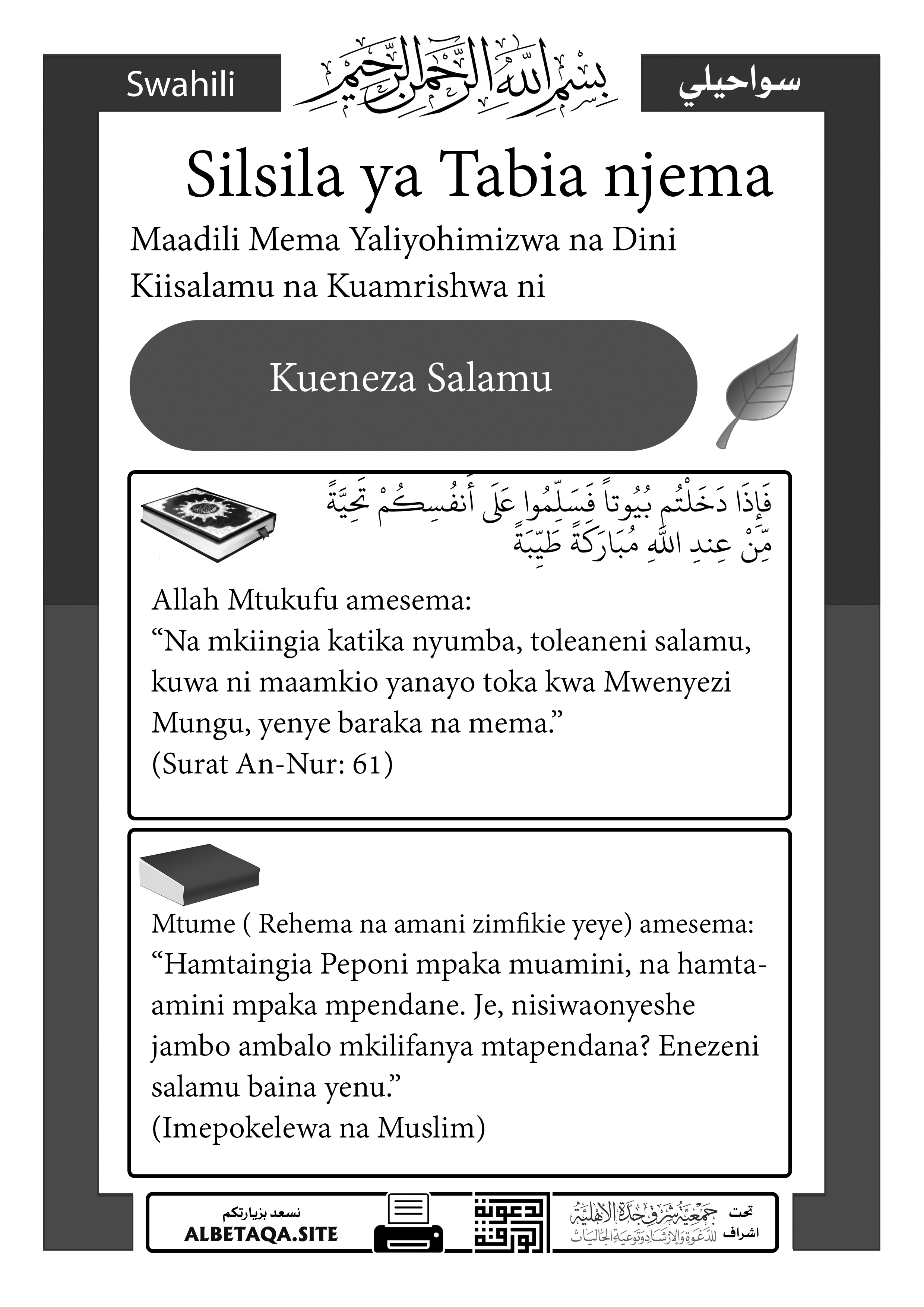 “Na mkiingia katika nyumba, toleaneni salamu, kuwa ni maamkio yanayo toka kwa Mwenyezi Mungu, yenye baraka na mema.”
