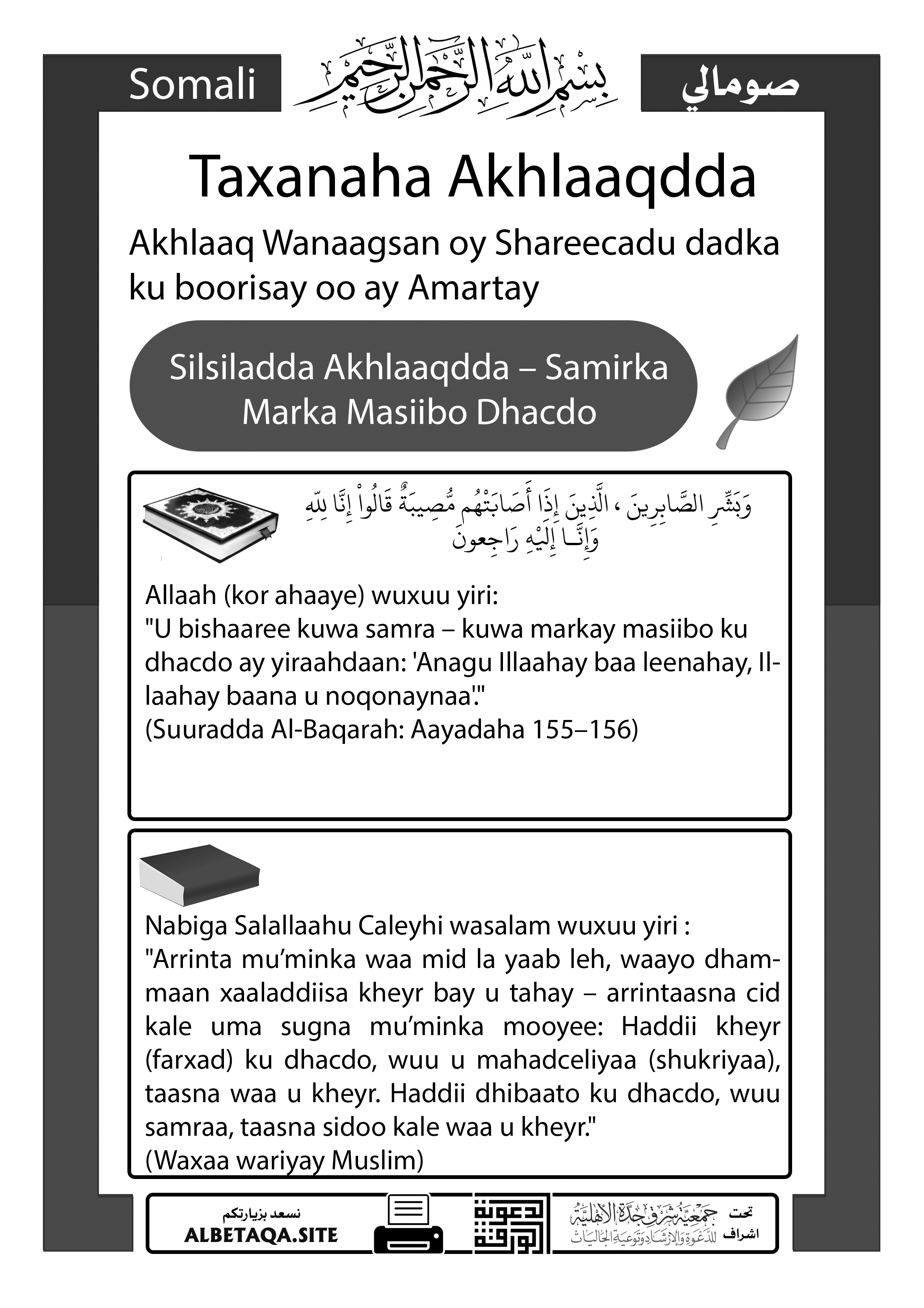 “U bishaaree kuwa samra – kuwa markay masiibo ku dhacdo ay yiraahdaan: ‘Anagu Illaahay baa leenahay, Illaahay baana u noqonaynaa’.”
