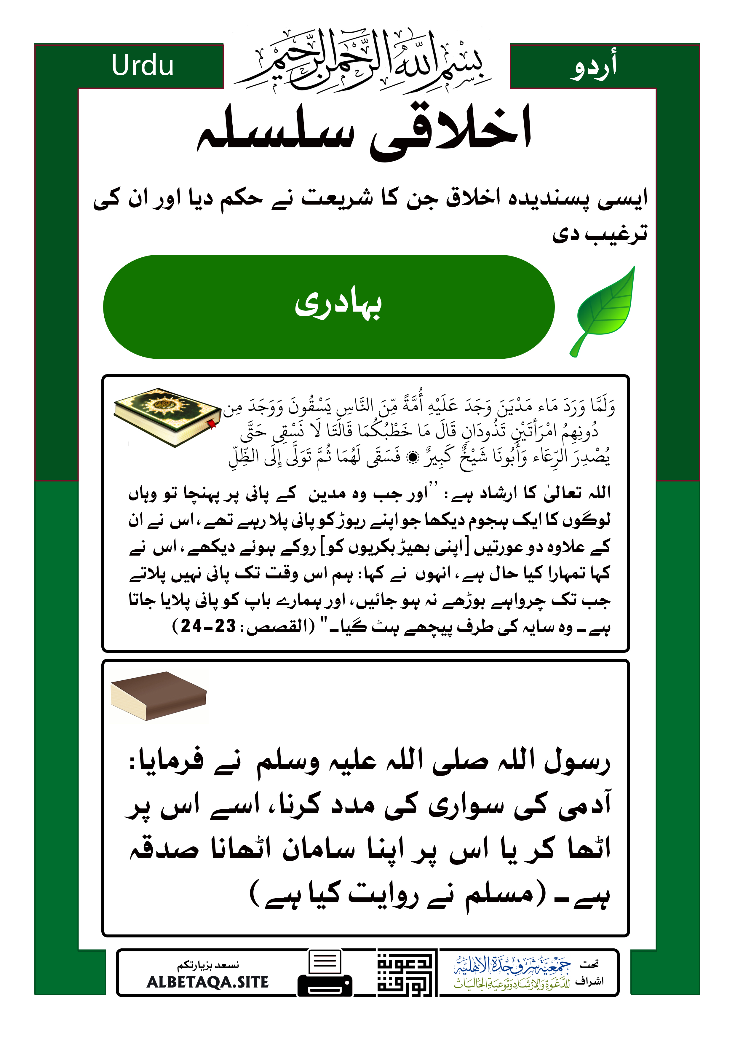 رسول اللہ صلی اللہ علیہ وسلم نے فرمایا: آدمی کی سواری کی مدد کرنا، اسے اس پر اٹھا کر یا اس پر اپنا سامان اٹھانا صدقہ ہے۔ (مسلم نے روایت کیا ہے)