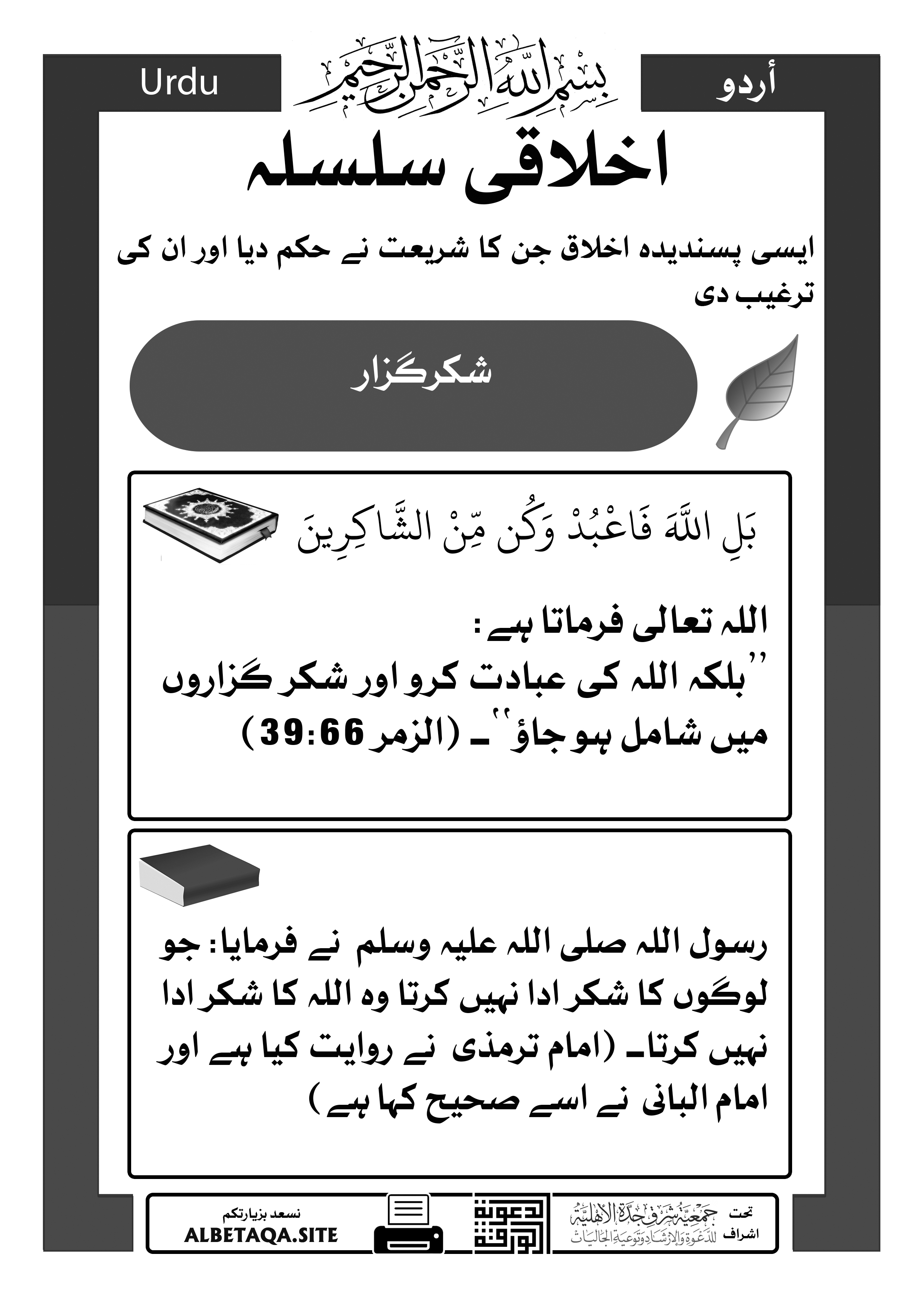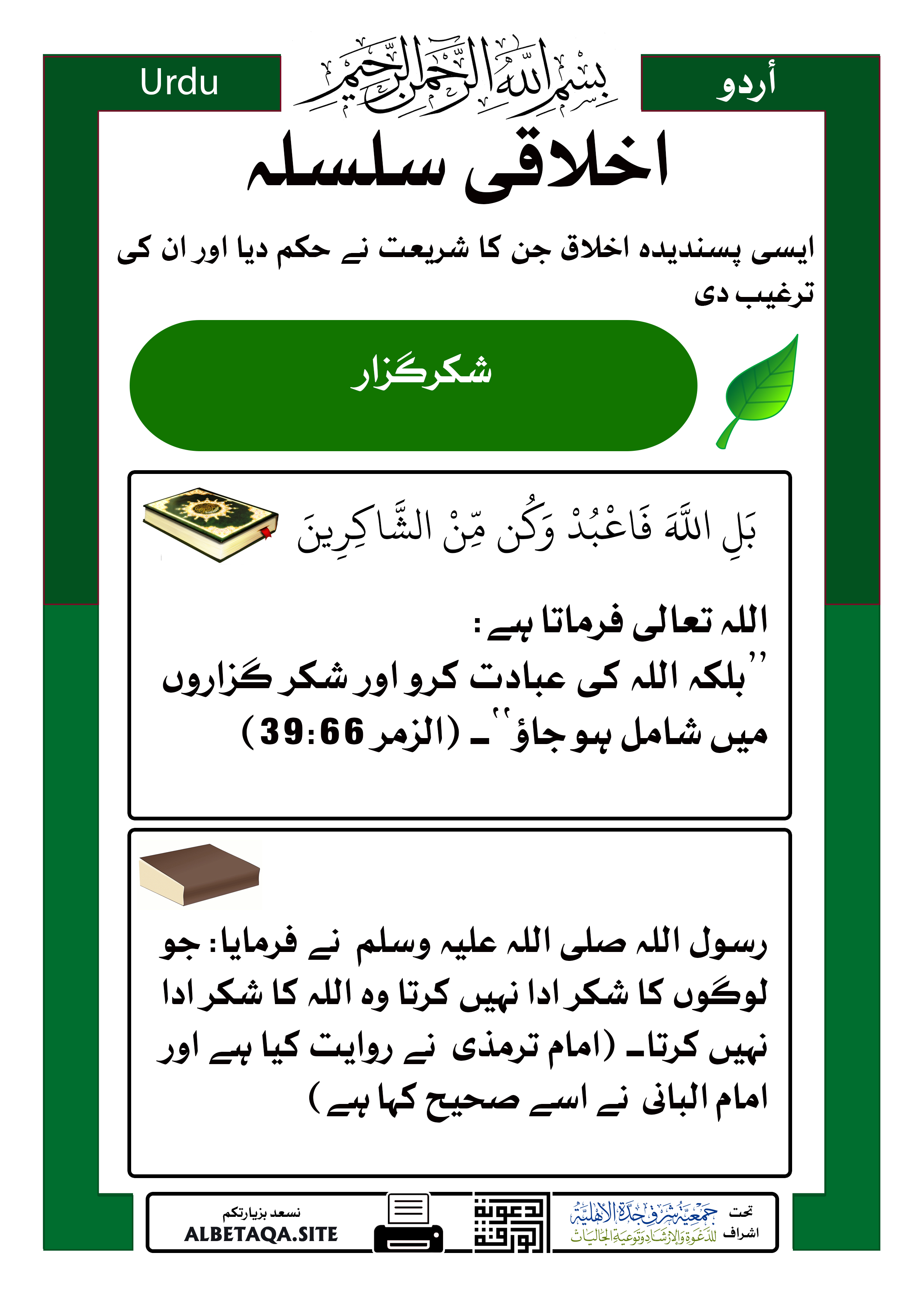 ’’بلکہ اللہ کی عبادت کرو اور شکر گزاروں میں شامل ہو جاؤ‘‘۔ (الزمر 39:66)