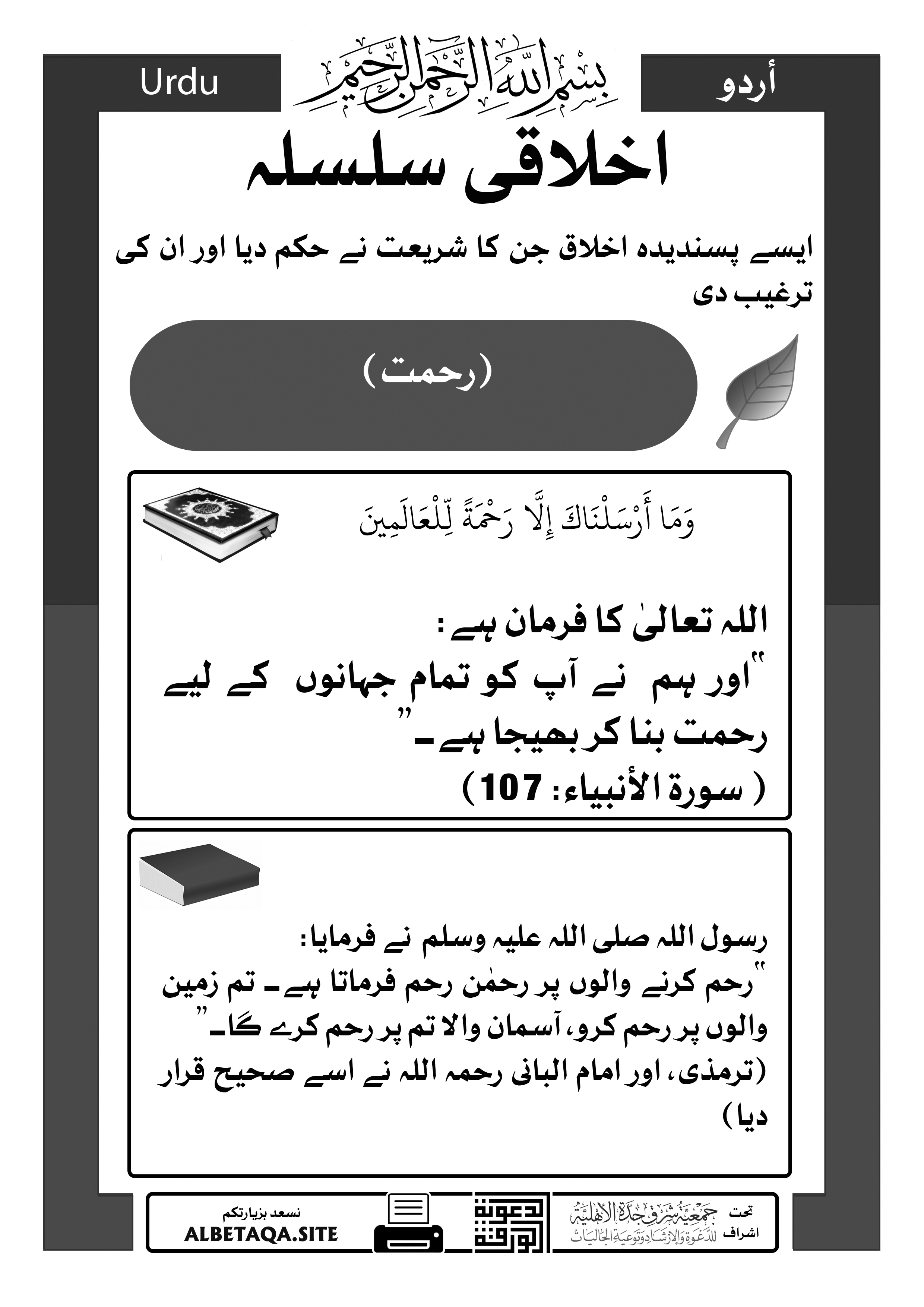 “رحم کرنے والوں پر رحمٰن رحم فرماتا ہے۔ تم زمین والوں پر رحم کرو، آسمان والا تم پر رحم کرے گا۔”
