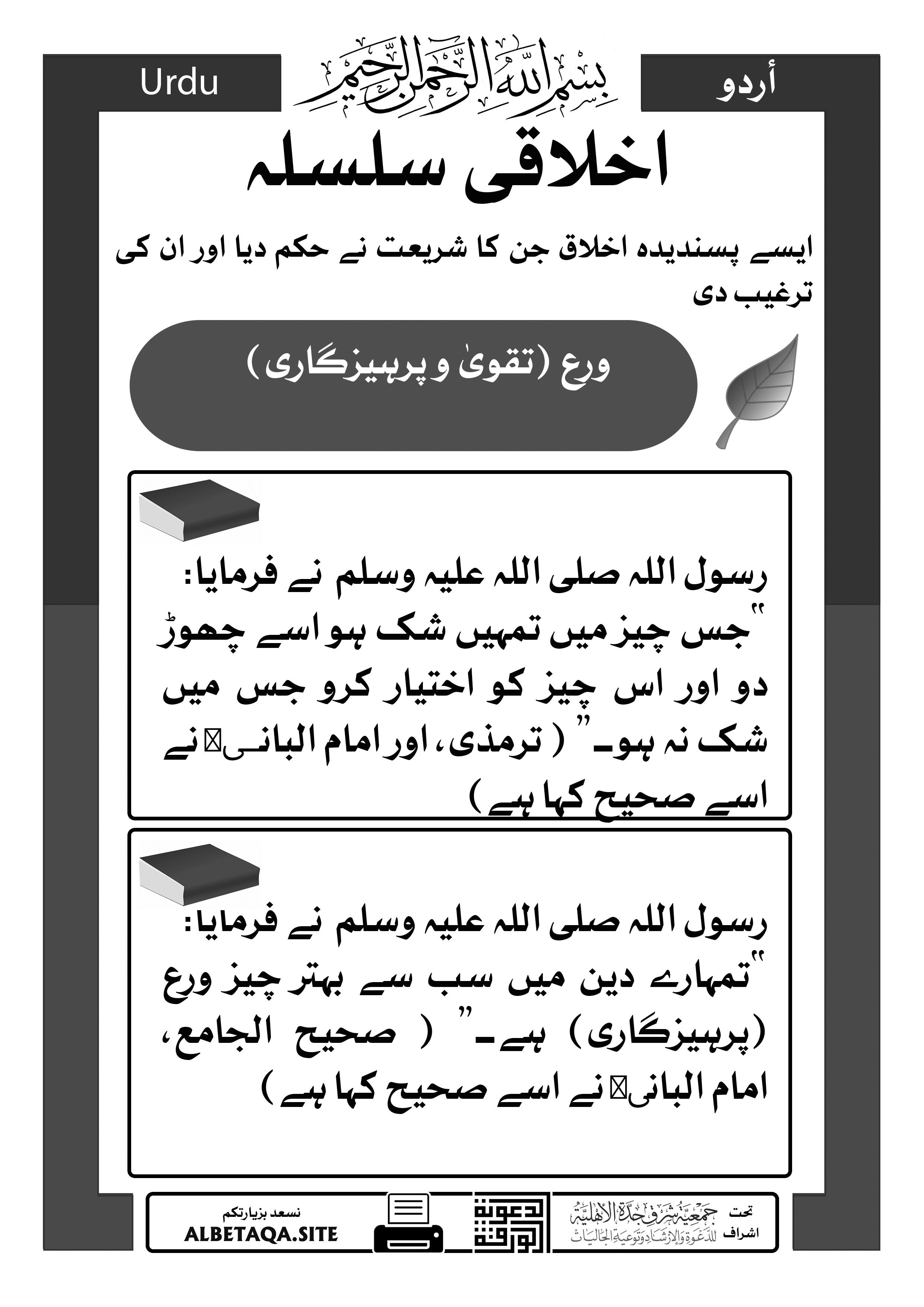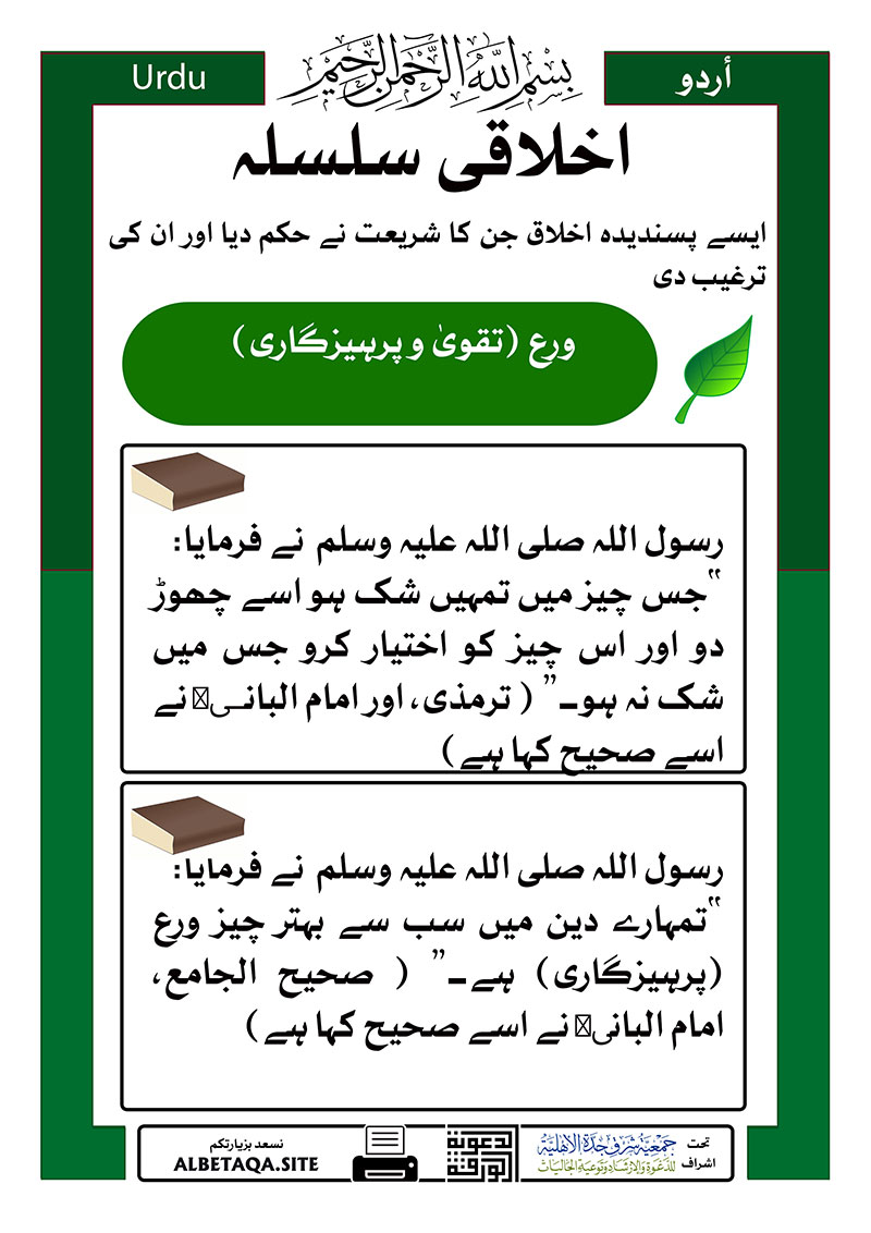 “تمہارے دین میں سب سے بہتر چیز ورع (پرہیزگاری) ہے۔” ( صحیح الجامع، امام البانیؒ نے اسے صحیح کہا ہے)