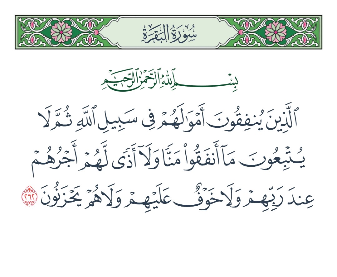 الذين ينفقون أموالهم في سبيل الله ثم لا يتبعون ما أنفقوا منا ولا أذى لهم أجرهم عند ربهم ولا خوف عليهم ولا هم يحزنون [البقرة : 262]