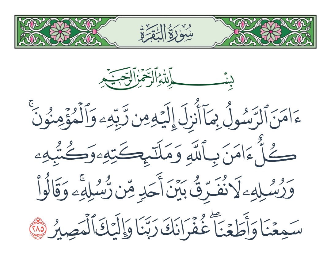 آمن الرسول بما أنزل إليه من ربه والمؤمنون كل آمن بالله وملآئكته وكتبه ورسله لا نفرق بين أحد من رسله وقالوا سمعنا وأطعنا غفرانك ربنا وإليك المصير [البقرة : 285]