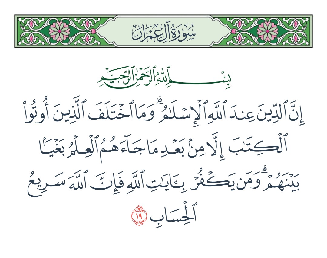 إن الدين عند الله الإسلام وما اختلف الذين أوتوا الكتاب إلا من بعد ما جاءهم العلم بغيا بينهم ومن يكفر بآيات الله فإن الله سريع الحساب [آل عمران : 19]