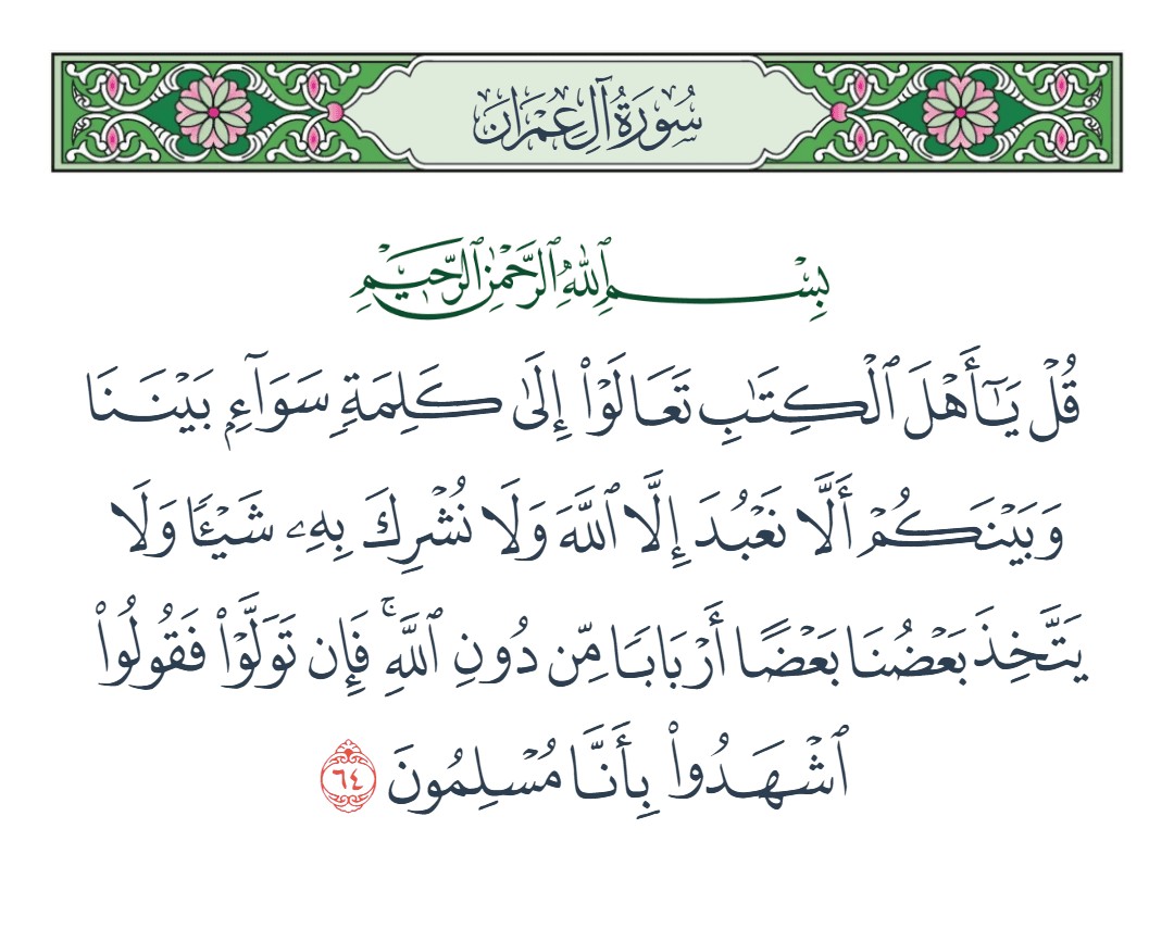 قل يا أهل الكتاب تعالوا إلى كلمة سواء بيننا وبينكم ألا نعبد إلا الله ولا نشرك به شيئا ولا يتخذ بعضنا بعضا أربابا من دون الله فإن تولوا فقولوا اشهدوا بأنا مسلمون [آل عمران : 64]