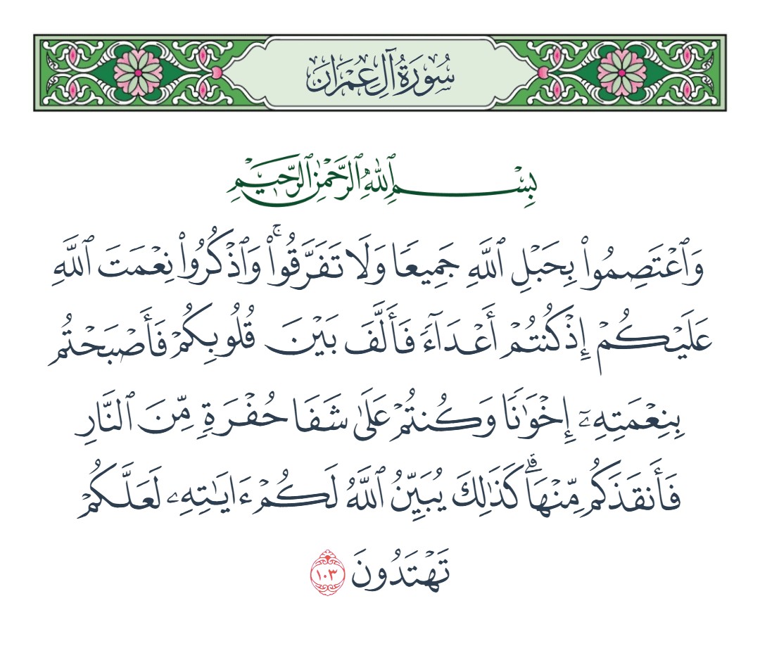 واعتصموا بحبل الله جميعا ولا تفرقوا واذكروا نعمت الله عليكم إذ كنتم أعداء فألف بين قلوبكم فأصبحتم بنعمته إخوانا وكنتم على شفا حفرة من النار فأنقذكم منها كذلك يبين الله لكم آياته لعلكم تهتدون [آل عمران : 103]
