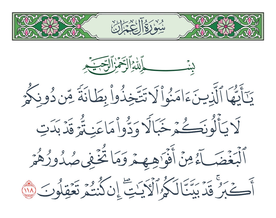 يا أيها الذين آمنوا لا تتخذوا بطانة من دونكم لا يألونكم خبالا ودوا ما عنتم قد بدت البغضاء من أفواههم وما تخفي صدورهم أكبر قد بينا لكم الآيات إن كنتم تعقلون [آل عمران : 118]