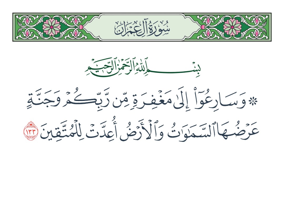 وسارعوا إلى مغفرة من ربكم وجنة عرضها السماوات والأرض أعدت للمتقين [آل عمران : 133]