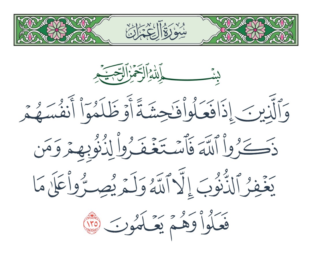 والذين إذا فعلوا فاحشة أو ظلموا أنفسهم ذكروا الله فاستغفروا لذنوبهم ومن يغفر الذنوب إلا الله ولم يصروا على ما فعلوا وهم يعلمون [آل عمران : 135]