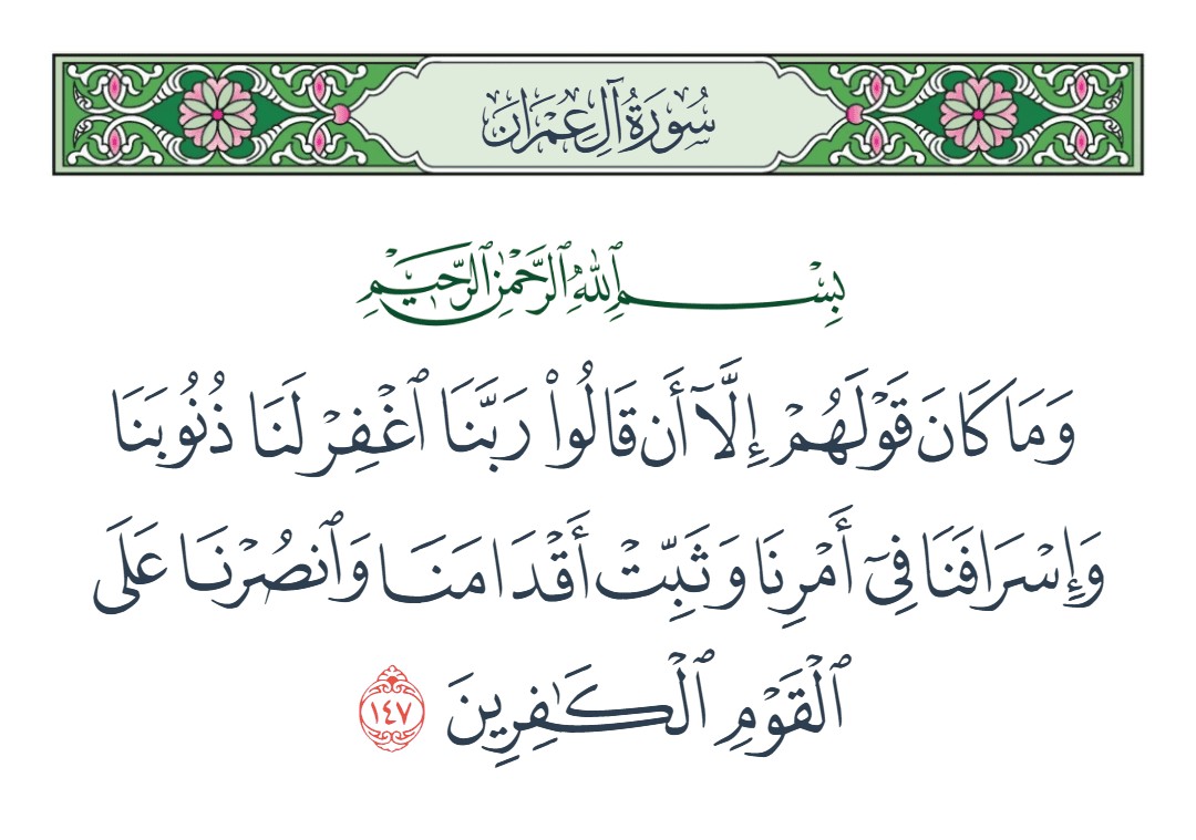 وما كان قولهم إلا أن قالوا ربنا اغفر لنا ذنوبنا وإسرافنا في أمرنا وثبت أقدامنا وانصرنا على القوم الكافرين [آل عمران : 147]