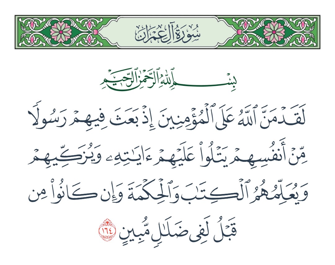 لقد من الله على المؤمنين إذ بعث فيهم رسولا من أنفسهم يتلو عليهم آياته ويزكيهم ويعلمهم الكتاب والحكمة وإن كانوا من قبل لفي ضلال مبين [آل عمران : 164]