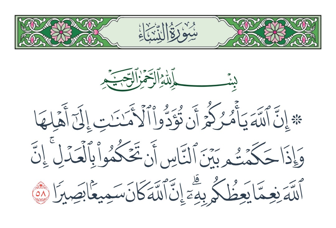 إن الله يأمركم أن تؤدوا الأمانات إلى أهلها وإذا حكمتم بين الناس أن تحكموا بالعدل إن الله نعما يعظكم به إن الله كان سميعا بصيرا [النساء : 58]