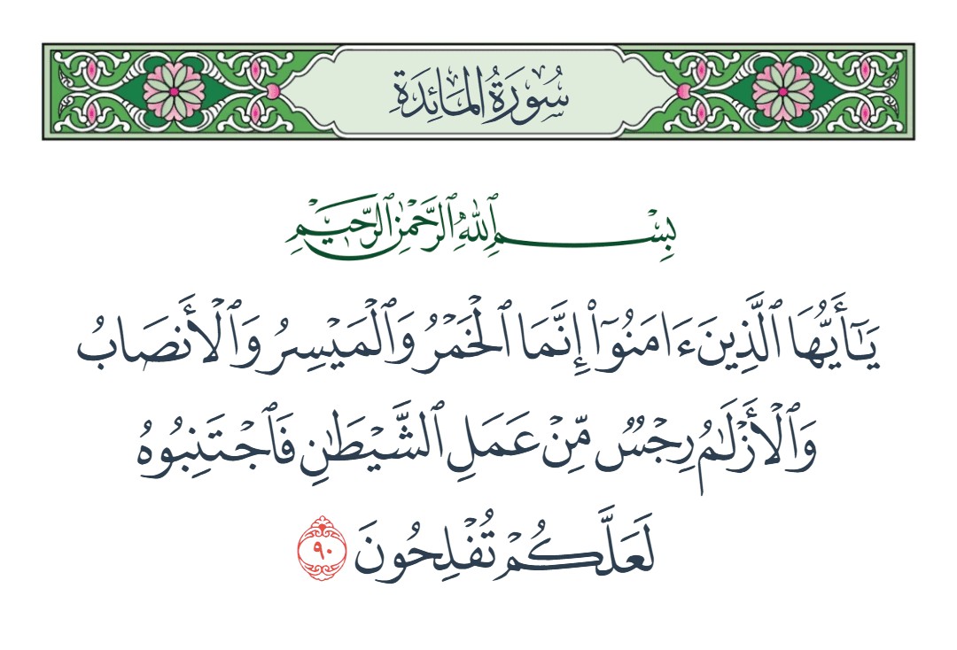 يا أيها الذين آمنوا إنما الخمر والميسر والأنصاب والأزلام رجس من عمل الشيطان فاجتنبوه لعلكم تفلحون [المائدة : 90]