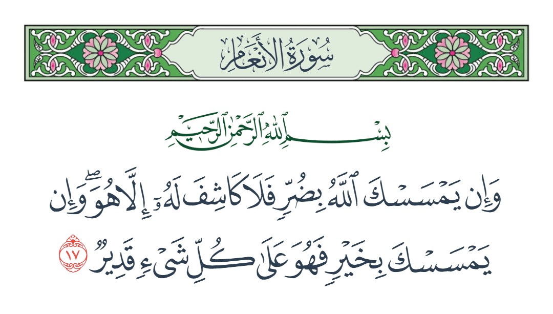 وإن يمسسك الله بضر فلا كاشف له إلا هو وإن يمسسك بخير فهو على كل شيء قدير [الأنعام : 17]