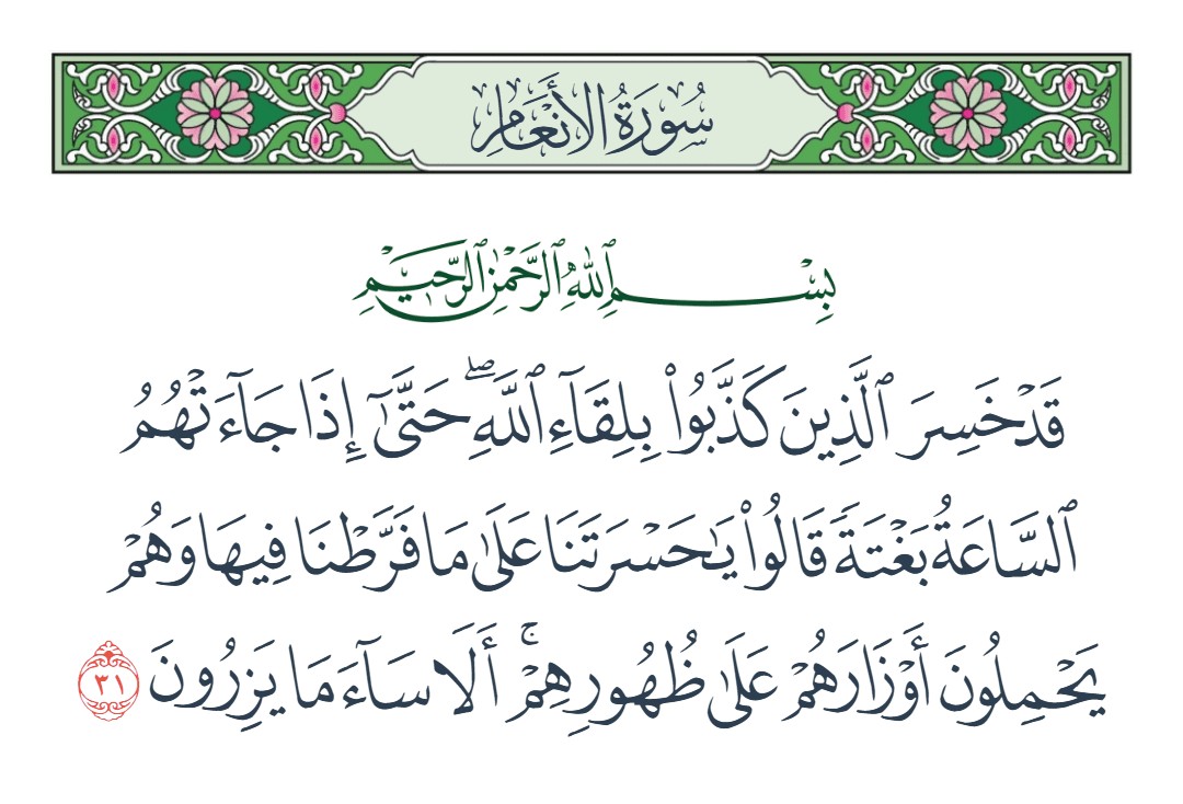قد خسر الذين كذبوا بلقاء الله حتى إذا جاءتهم الساعة بغتة قالوا يا حسرتنا على ما فرطنا فيها وهم يحملون أوزارهم على ظهورهم ألا ساء ما يزرون [الأنعام : 31]