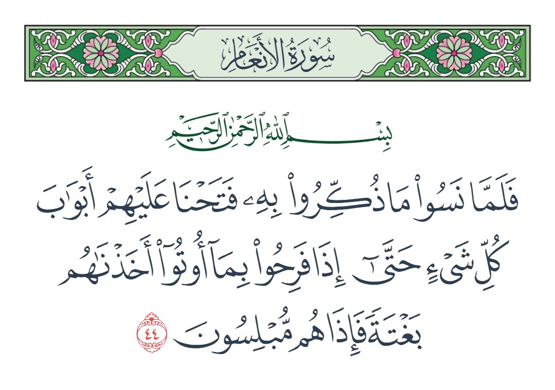 فلما نسوا ما ذكروا به فتحنا عليهم أبواب كل شيء حتى إذا فرحوا بما أوتوا أخذناهم بغتة فإذا هم مبلسون [الأنعام : 44]