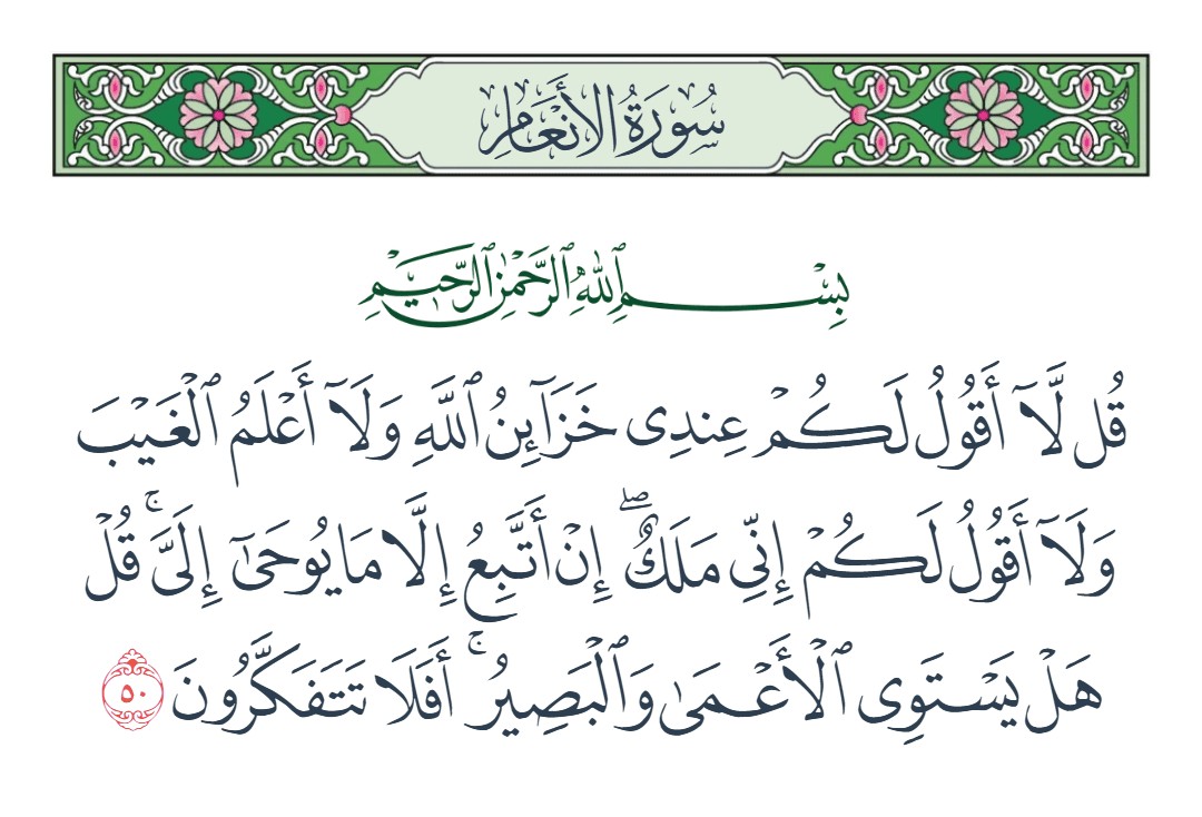 قل لا أقول لكم عندي خزآئن الله ولا أعلم الغيب ولا أقول لكم إني ملك إن أتبع إلا ما يوحى إلي قل هل يستوي الأعمى والبصير أفلا تتفكرون [الأنعام : 50]