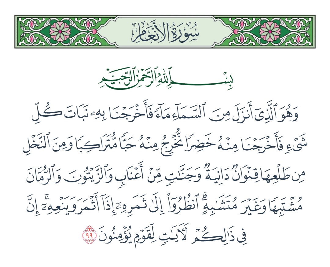 وهو الذي أنزل من السماء ماء فأخرجنا به نبات كل شيء فأخرجنا منه خضرا نخرج منه حبا متراكبا ومن النخل من طلعها قنوان دانية وجنات من أعناب والزيتون والرمان مشتبها وغير متشابه انظروا إلى ثمره إذا أثمر وينعه إن في ذلكم لآيات لقوم يؤمنون [الأنعام : 99]