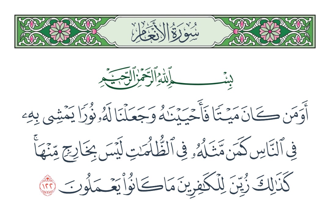 أو من كان ميتا فأحييناه وجعلنا له نورا يمشي به في الناس كمن مثله في الظلمات ليس بخارج منها كذلك زين للكافرين ما كانوا يعملون [الأنعام : 122]