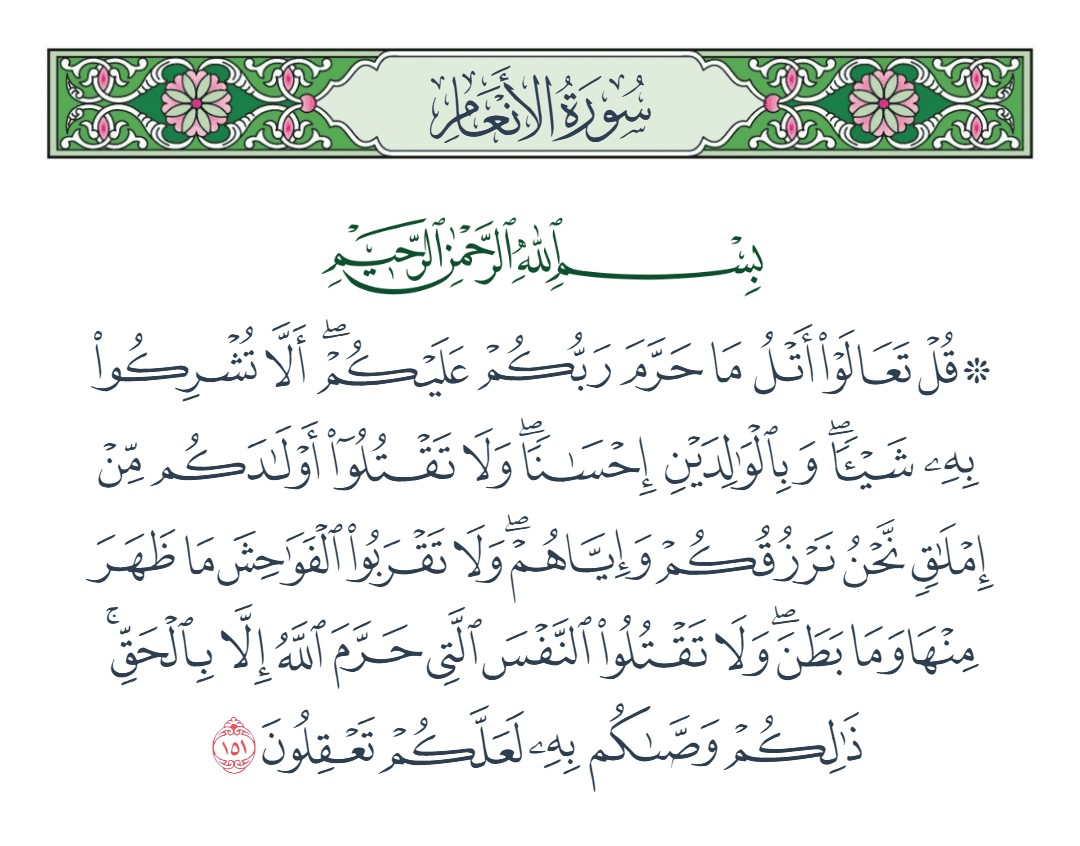 قل تعالوا أتل ما حرم ربكم عليكم ألا تشركوا به شيئا وبالوالدين إحسانا ولا تقتلوا أولادكم من إملاق نحن نرزقكم وإياهم ولا تقربوا الفواحش ما ظهر منها وما بطن ولا تقتلوا النفس التي حرم الله إلا بالحق ذلكم وصاكم به لعلكم تعقلون [الأنعام : 151]